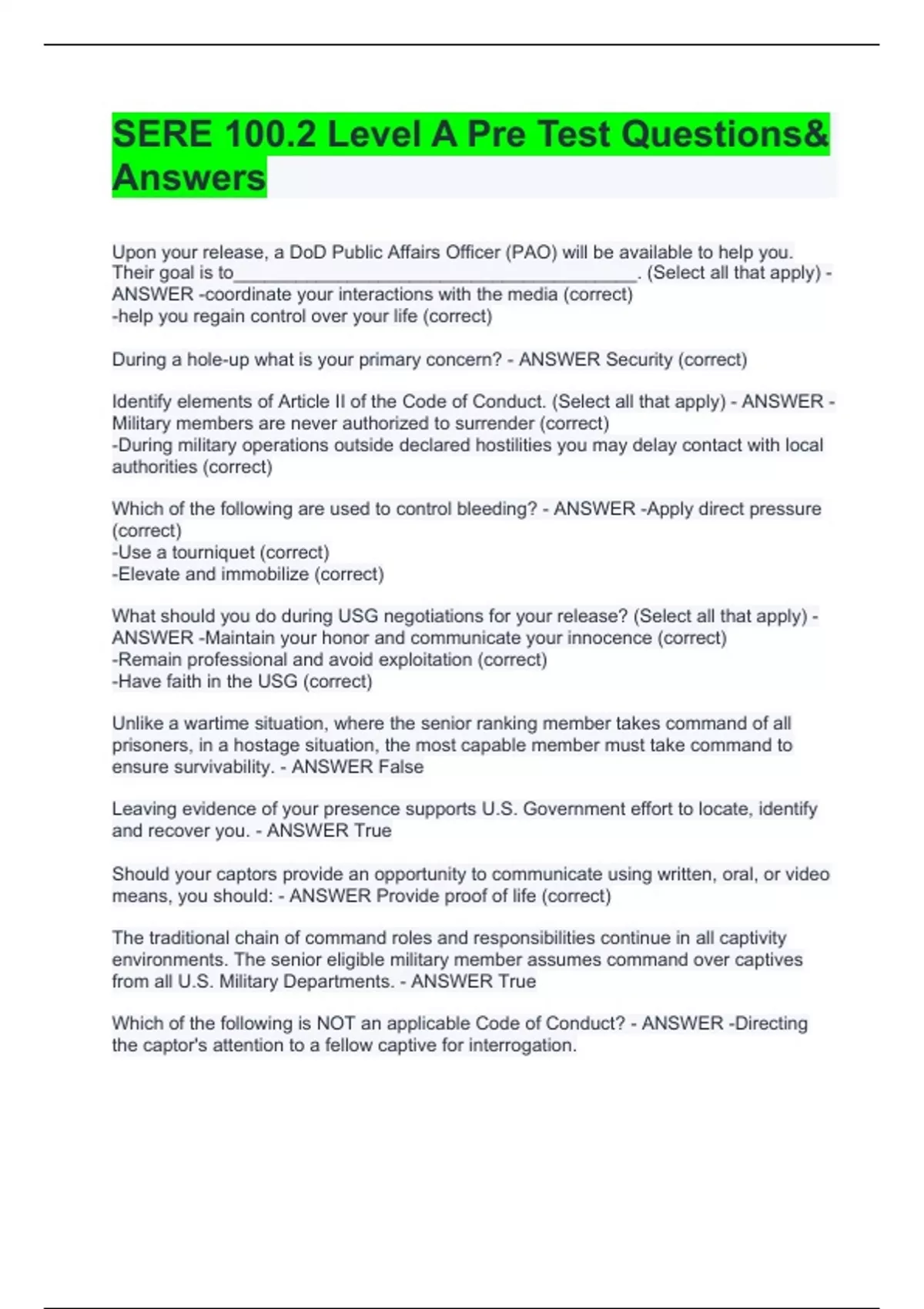 Upon your release, a DoD Public Affairs Officer (PAO) will be available to help you. Their goal is to_______________________________________. (Select all that apply) - ANSWER -coordinate your interactions with the media (correct) -help you regain control over your life (correct) During a hole-up what is your primary concern? - ANSWER Security (correct) Identify elements of Article II of the Code of Conduct. (Select all that apply) - ANSWER -Military members are never authorized to surrender (correct) -During military operations outside declared hostilities you may delay contact with local authorities (correct) Which of the following are used to control bleeding? - ANSWER -Apply direct pressure (correct) -Use a tourniquet (correct) -Elevate and immobilize (correct) What should you do during USG negotiations for your release? (Select all that apply) - ANSWER -Maintain your honor and communicate your innocence (correct) -Remain professional and avoid exploitation (correct) -Have faith in the USG (correct) Unlike a wartime situation, where the senior ranking member takes command of all prisoners, in a hostage situation, the most capable member must take command to ensure survivability. - ANSWER False Leaving evidence of your presence supports U.S. Government effort to locate, identify and recover you. - ANSWER True Should your captors provide an opportunity to communicate using written, oral, or video means, you should: - ANSWER Provide proof of life (correct) The traditional chain of command roles and responsibilities continue in all captivity environments. The senior eligible military member assumes command over captives from all U.S. Military Departments. - ANSWER True Which of the following is NOT an applicable Code of Conduct? - ANSWER -Directing the captor's attention to a fellow captive for interrogation. If captured, you must give no information or take part in any action which might be harmful to your comrades. This is an example of__________ under article IV of the Code of Conduct. - ANSWER Keeping Faith Which of the Code of Conduct article articulates the emotional connection between the Service member and the concept of sacrifice, as a requirement for honorable military