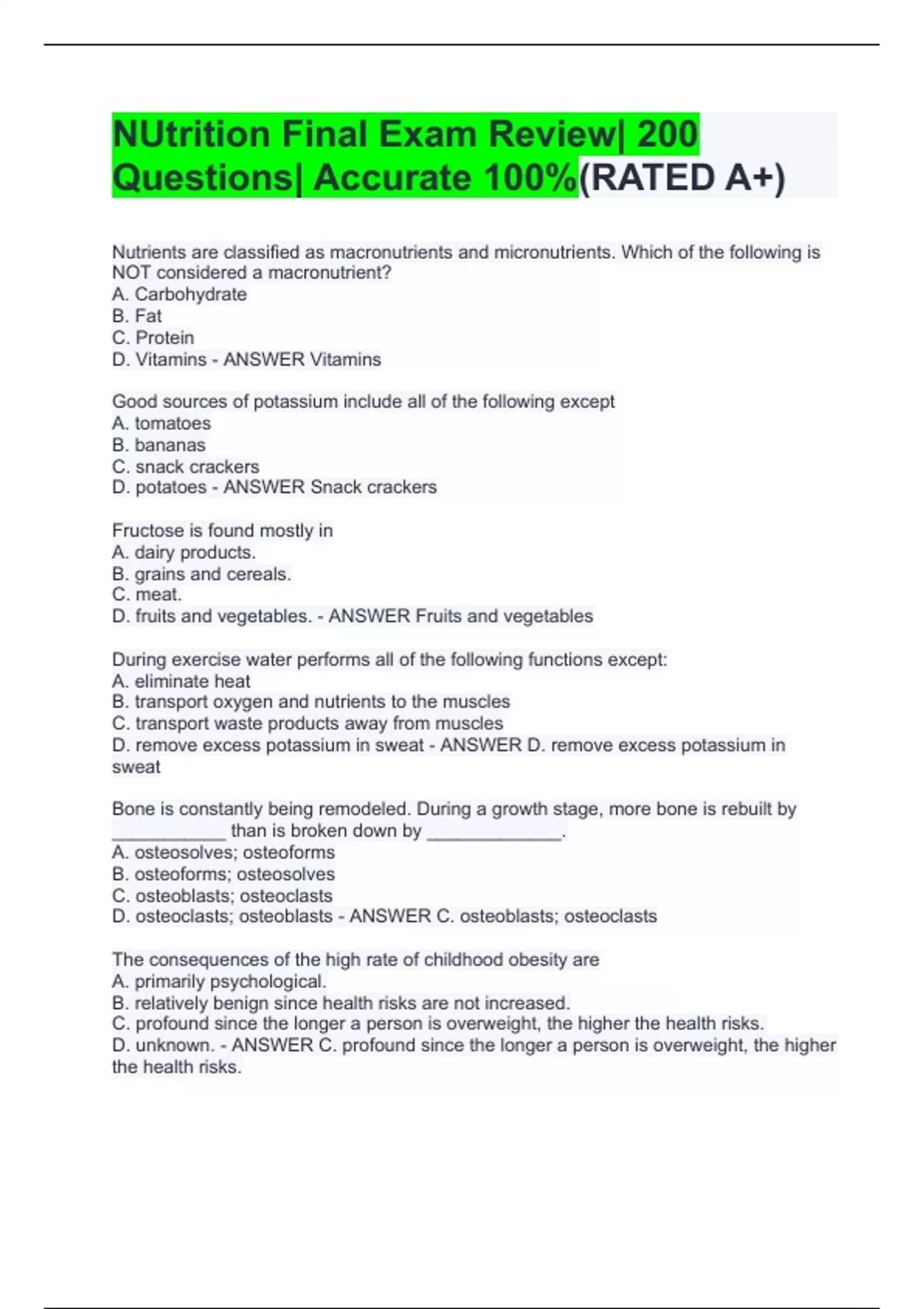 Nutrients are classified as macronutrients and micronutrients. Which of the following is NOT considered a macronutrient? A. Carbohydrate B. Fat C. Protein D. Vitamins - ANSWER Vitamins Good sources of potassium include all of the following except A. tomatoes B. bananas C. snack crackers D. potatoes - ANSWER Snack crackers Fructose is found mostly in A. dairy products. B. grains and cereals. C. meat. D. fruits and vegetables. - ANSWER Fruits and vegetables During exercise water performs all of the following functions except: A. eliminate heat B. transport oxygen and nutrients to the muscles C. transport waste products away from muscles D. remove excess potassium in sweat - ANSWER D. remove excess potassium in sweat Bone is constantly being remodeled. During a growth stage, more bone is rebuilt by ___________ than is broken down by _____________. A. osteosolves; osteoforms B. osteoforms; osteosolves C. osteoblasts; osteoclasts D. osteoclasts; osteoblasts - ANSWER C. osteoblasts; osteoclasts The consequences of the high rate of childhood obesity are A. primarily psychological. B. relatively benign since health risks are not increased. C. profound since the longer a person is overweight, the higher the health risks. D. unknown. - ANSWER C. profound since the longer a person is overweight, the higher the health risks. In a controlled study, if neither the subjects nor the investigators know which subjects are receiving treatment, the study is called a(n) A. double blind study B. single blind study C. variable study D. undirected study - ANSWER A. double blind study