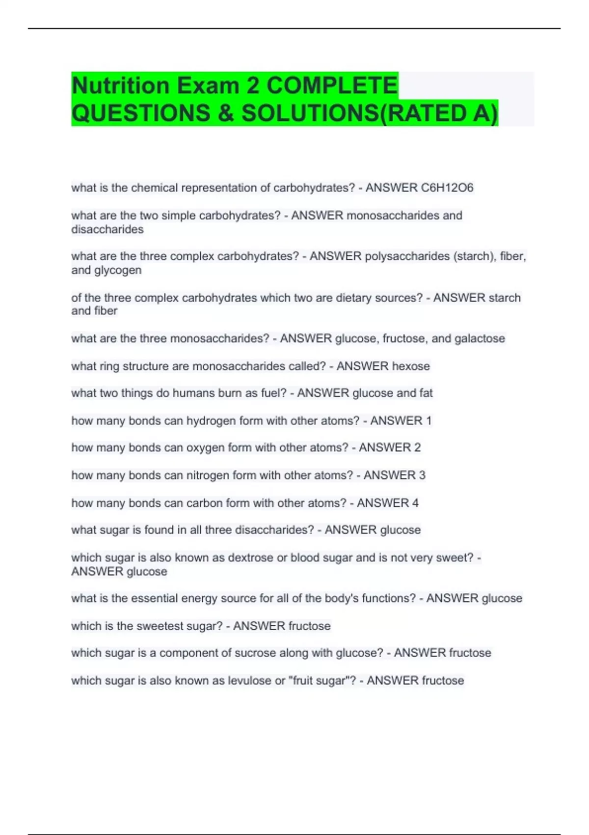 nutrition exam 2 complete questions solutionsra