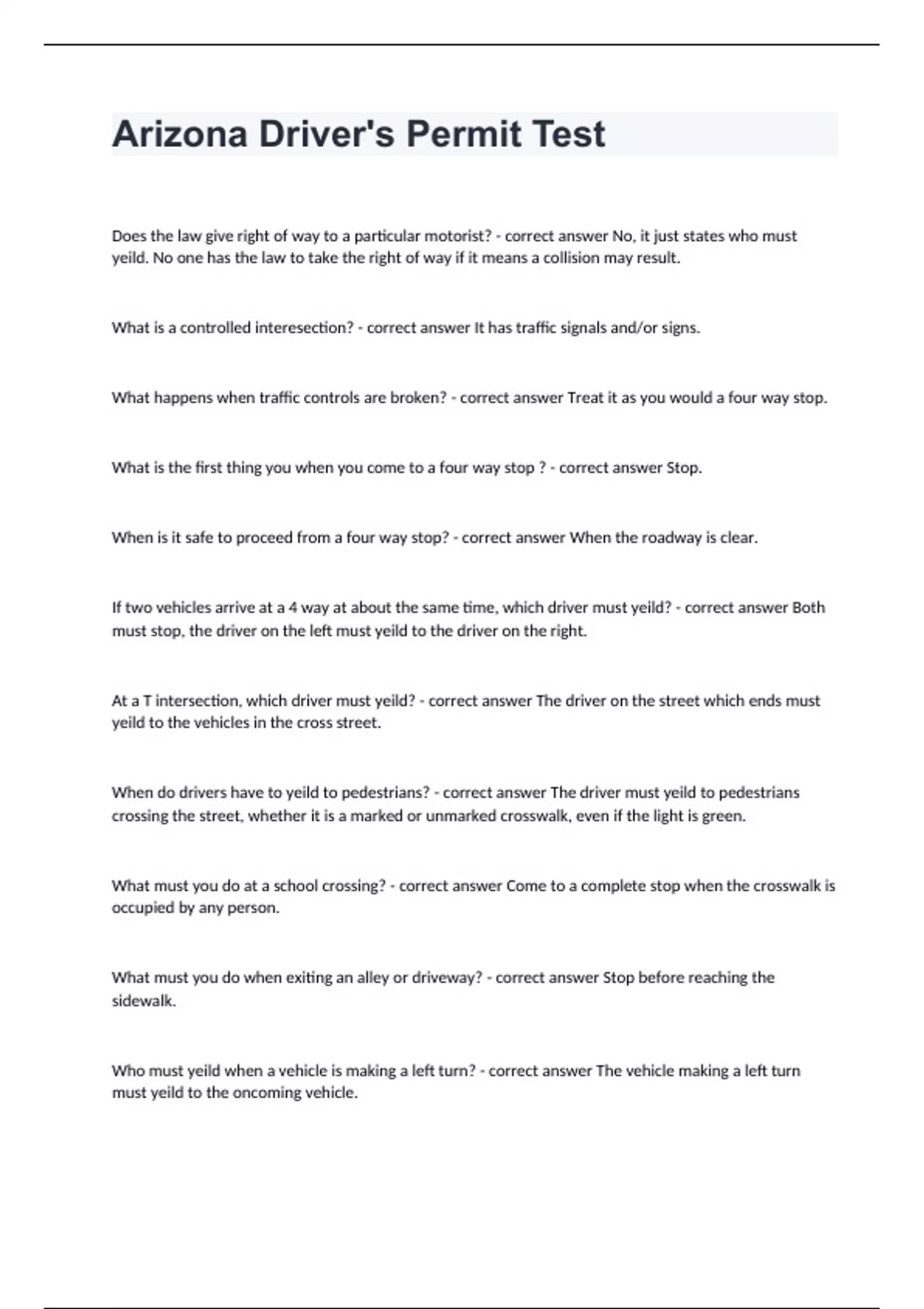 Arizona Driver's Permit TestDoes the law give right of way to a particular motorist? - correct answer No, it just states who must yeild. No one has the law to take the right of way if it means a collision may result. What is a controlled interesection? - correct answer It has traffic signals and/or signs. What happens when traffic controls are broken? - correct answer Treat it as you would a four way stop. What is the first thing you when you come to a four way stop ? - correct answer Stop. When is it safe to proceed from a four way stop? - correct answer When the roadway is clear. If two vehicles arrive at a 4 way at about the same time, which driver must yeild? - correct answer Both must stop, the driver on the left must yeild to the driver on the right. At a T intersection, which driver must yeild? - correct answer The driver on the street which ends must yeild to the vehicles in the cross street. When do drivers have to yeild to pedestrians? - correct answer The driver must yeild to pedestrians crossing the street, whether it is a marked or unmarked crosswalk, even if the light is green. What must you do at a school crossing? - correct answer Come to a complete stop when the crosswalk is occupied by any person. What must you do when exiting an alley or driveway? - correct answer Stop before reaching the sidewalk. Who must yeild when a vehicle is making a left turn? - correct answer The vehicle making a left turn must yeild to the oncoming vehicle.
