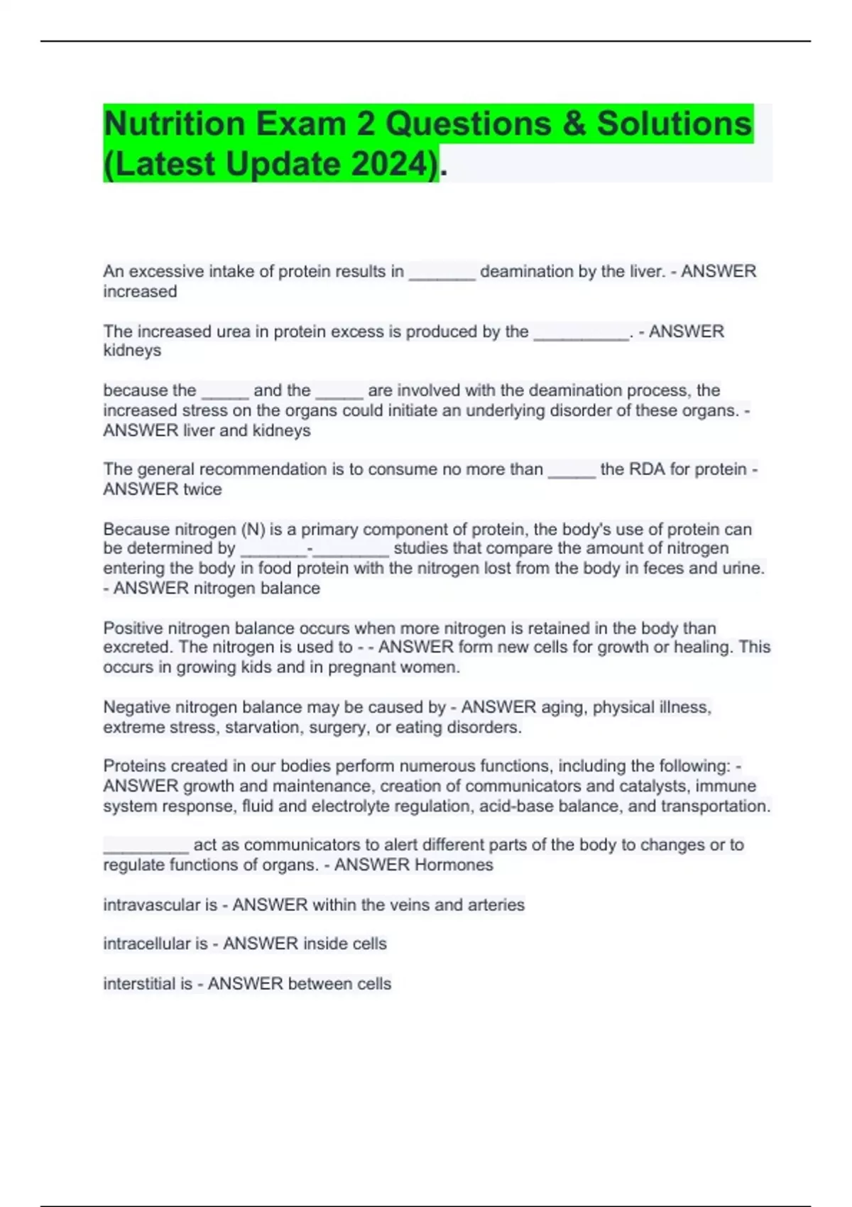 An excessive intake of protein results in _______ deamination by the liver. - ANSWER increased The increased urea in protein excess is produced by the __________. - ANSWER kidneys because the _____ and the _____ are involved with the deamination process, the increased stress on the organs could initiate an underlying disorder of these organs. - ANSWER liver and kidneys The general recommendation is to consume no more than _____ the RDA for protein - ANSWER twice Because nitrogen (N) is a primary component of protein, the body's use of protein can be determined by _______-________ studies that compare the amount of nitrogen entering the body in food protein with the nitrogen lost from the body in feces and urine. - ANSWER nitrogen balance Positive nitrogen balance occurs when more nitrogen is retained in the body than excreted. The nitrogen is used to - - ANSWER form new cells for growth or healing. This occurs in growing kids and in pregnant women. Negative nitrogen balance may be caused by - ANSWER aging, physical illness, extreme stress, starvation, surgery, or eating disorders. Proteins created in our bodies perform numerous functions, including the following: - ANSWER growth and maintenance, creation of communicators and catalysts, immune system response, fluid and electrolyte regulation, acid-base balance, and transportation. _________ act as communicators to alert different parts of the body to changes or to regulate functions of organs. - ANSWER Hormones intravascular is - ANSWER within the veins and arteries intracellular is - ANSWER inside cells interstitial is - ANSWER between cells