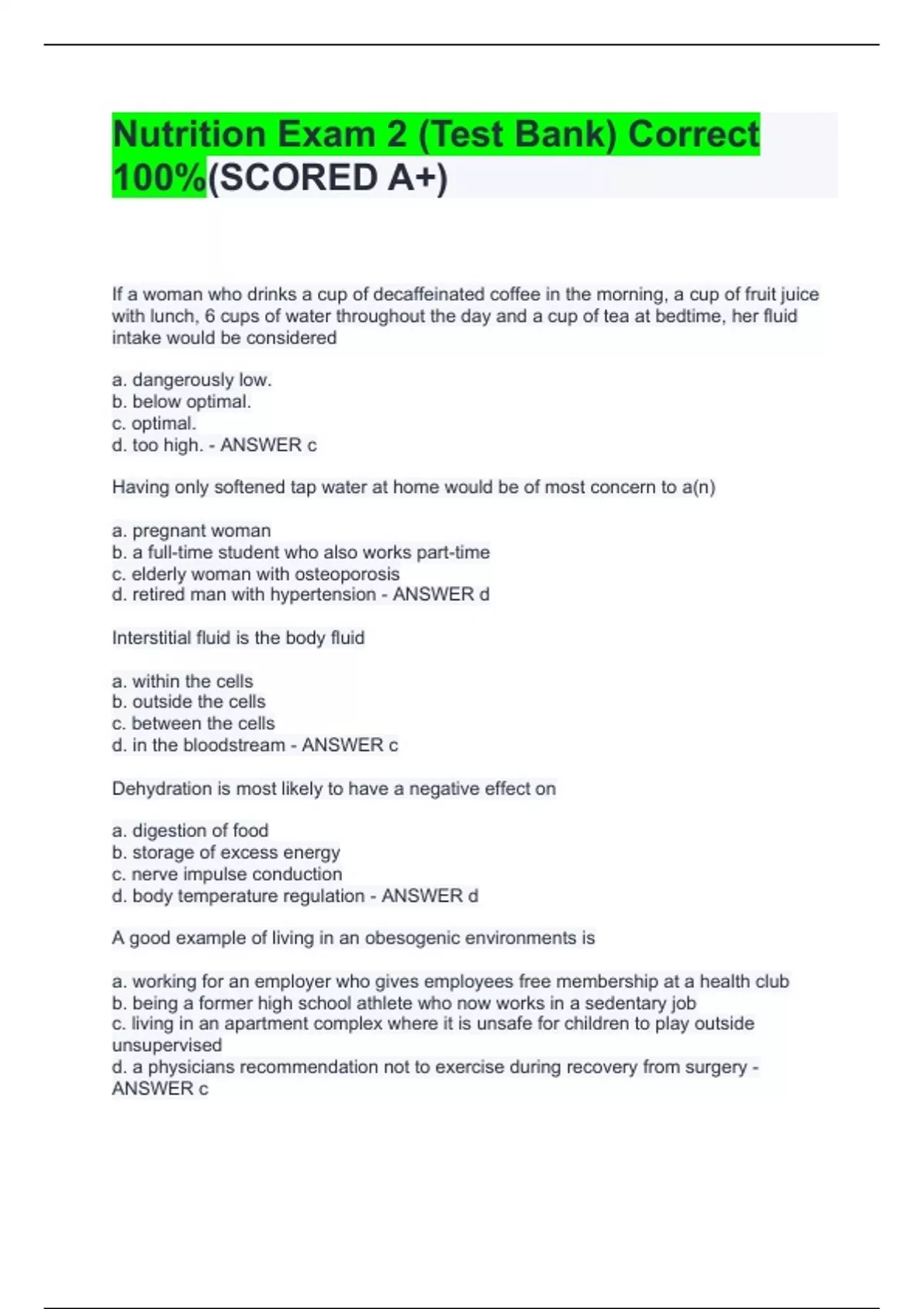If a woman who drinks a cup of decaffeinated coffee in the morning, a cup of fruit juice with lunch, 6 cups of water throughout the day and a cup of tea at bedtime, her fluid intake would be considered a. dangerously low. b. below optimal. c. optimal. d. too high. - ANSWER c Having only softened tap water at home would be of most concern to a(n) a. pregnant woman b. a full-time student who also works part-time c. elderly woman with osteoporosis d. retired man with hypertension - ANSWER d Interstitial fluid is the body fluid a. within the cells b. outside the cells c. between the cells d. in the bloodstream - ANSWER c Dehydration is most likely to have a negative effect on a. digestion of food b. storage of excess energy c. nerve impulse conduction d. body temperature regulation - ANSWER d A good example of living in an obesogenic environments is a. working for an employer who gives employees free membership at a health club b. being a former high school athlete who now works in a sedentary job c. living in an apartment complex where it is unsafe for children to play outside unsupervised d. a physicians recommendation not to exercise during recovery from surgery - ANSWER c The total amount of energy in a bowl of soup that contains 5g of protein, 2g of fat, and 20g of carb is ____ kcal a. 27 b. 108 c. 118 d. 133 - ANSWER c The fuel for all body processes that traps energy released from food is a. elec