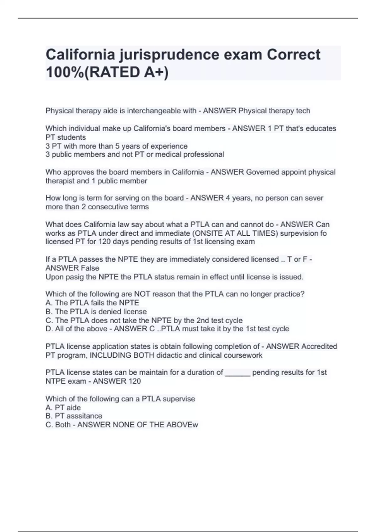 Physical therapy aide is interchangeable with - ANSWER Physical therapy tech Which individual make up California's board members - ANSWER 1 PT that's educates PT students 3 PT with more than 5 years of experience 3 public members and not PT or medical professional Who approves the board members in California - ANSWER Governed appoint physical therapist and 1 public member How long is term for serving on the board - ANSWER 4 years, no person can sever more than 2 consecutive terms What does California law say about what a PTLA can and cannot do - ANSWER Can works as PTLA under direct and immediate (ONSITE AT ALL TIMES) surpevision fo licensed PT for 120 days pending results of 1st licensing exam If a PTLA passes the NPTE they are immediately considered licensed .. T or F - ANSWER False Upon pasig the NPTE the PTLA status remain in effect until license is issued. Which of the following are NOT reason that the PTLA can no longer practice? A. The PTLA fails the NPTE B. The PTLA is denied license C. The PTLA does not take the NPTE by the 2nd test cycle D. All of the above - ANSWER C ..PTLA must take it by the 1st test cycle PTLA license application states is obtain following completion of - ANSWER Accredited PT program, INCLUDING BOTH didactic and clinical coursework PTLA license states can be maintain for a duration of ______ pending results for 1st NTPE exam - ANSWER 120 Which of the following can a PTLA supervise A. PT aide B. PT asssitance C. Both - ANSWER NONE OF THE ABOVEw What are the only two situation where the status of PTLA is give - ANSWER 1) following graduation from accredited national program 2) following completion of NPTE for a graduate from foreign school who is seeking license in California and is fullfiling clinical rotation requirements PTLA status will be granted following graduation caution from an approved education program for _________ days pending results of 1st licensing exam - ANSWER 120 What are two documents that a supervising PT of a PTLA must maintain on site at all times - ANSWER Document receipt of letter authorizing PTLA and record of expiration date T or F : participation in a diversion program is given to future employer - ANSWER False... participation is confidential i In order to be in a diversion program the participant must undergo... - ANSWER ALL medical and psychiatric evaluation DEEMED necessary An PTLA can sit for the NPTE ____ times per application per ___month time period - ANSWER 3 12 mont time period If applicant has not passed NPTE within 1 year which of the following is true. A. the applicant cannot apply for 1 whole year B. The applicant can reapply and fees are waived C. Applicant needs to send in new application, application fee and re-examination fee - ANSWER C If the license fee has no been paid within 5 years then _________ - ANSWER Application will be considered 'abdonnned.