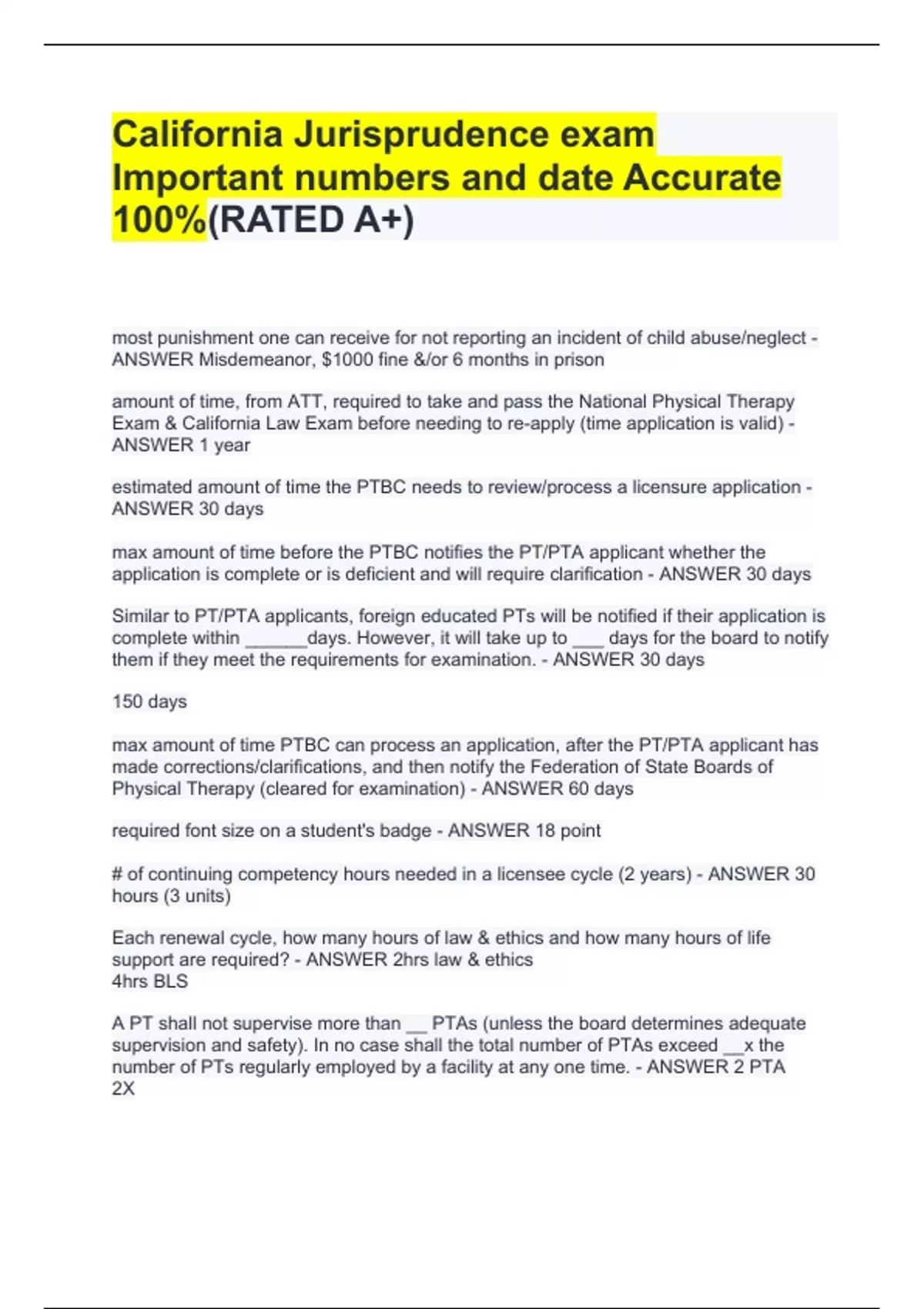 most punishment one can receive for not reporting an incident of child abuse/neglect - ANSWER Misdemeanor, $1000 fine &/or 6 months in prison amount of time, from ATT, required to take and pass the National Physical Therapy Exam & California Law Exam before needing to re-apply (time application is valid) - ANSWER 1 year estimated amount of time the PTBC needs to review/process a licensure application - ANSWER 30 days max amount of time before the PTBC notifies the PT/PTA applicant whether the application is complete or is deficient and will require clarification - ANSWER 30 days Similar to PT/PTA applicants, foreign educated PTs will be notified if their application is complete within ______days. However, it will take up to ___ days for the board to notify them if they meet the requirements for examination. - ANSWER 30 days 150 days max amount of time PTBC can process an application, after the PT/PTA applicant has made corrections/clarifications, and then notify the Federation of State Boards of Physical Therapy (cleared for examination) - ANSWER 60 days required font size on a student's badge - ANSWER 18 point # of continuing competency hours needed in a licensee cycle (2 years) - ANSWER 30 hours (3 units) Each renewal cycle, how many hours of law & ethics and how many hours of life support are required? - ANSWER 2hrs law & ethics 4hrs BLS A PT shall not supervise more than __ PTAs (unless the board determines adequate supervision and safety). In no case shall the total number of PTAs exceed __x the number of PTs regularly employed by a facility at any one time. - ANSWER 2 PTA 2X Time given to pay initial license fee before application is considered abandoned - ANSWER 5 years its after 5 years, license has expired, PT wants to renew it, now what? - ANSWER Can be eligible again for licensure upon re-exam and filing updated application time frame in which a change in address needs to be reported to the board (otherwise will result in a citation and administrative fine) - ANSWER 30 days the max amount of time the board can suspend, revoke or impose provationary condition on a PT/PTA license for unprofessional conduct - ANSWER 1 year initial license fee for PT Application - ANSWER 300 PT license fee - ANSWER $100 application fee (or license renewal fee) for PT/PTA - ANSWER $300 Length of Time Administrative Citations Stay on Record - ANSWER 5 years. A citation is erased from licensee records 5 years from the date of issuance. If citation withdrawn or dismissed, the are removed immediately from the licensee record.