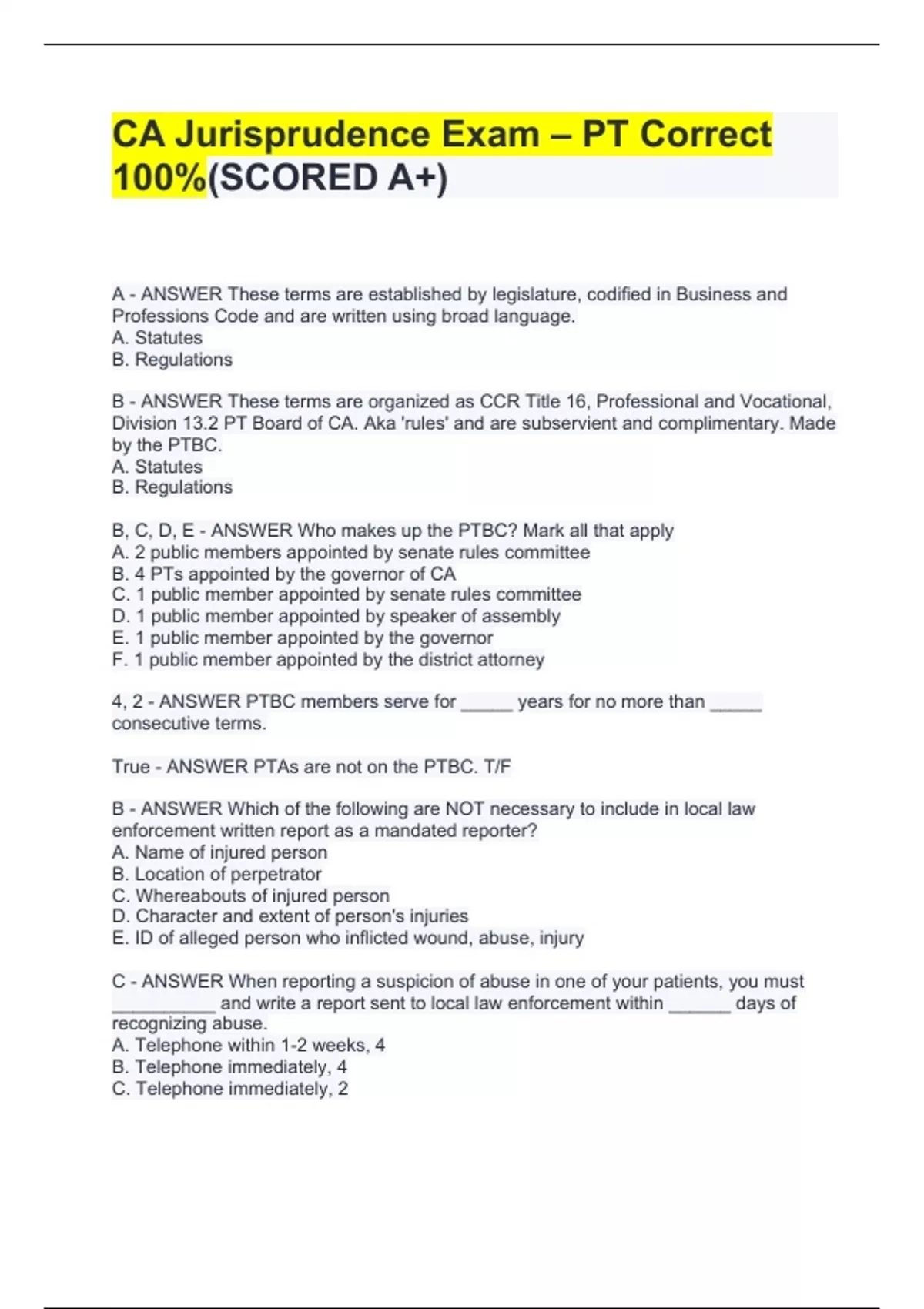 A - ANSWER These terms are established by legislature, codified in Business and Professions Code and are written using broad language. A. Statutes B. Regulations B - ANSWER These terms are organized as CCR Title 16, Professional and Vocational, Division 13.2 PT Board of CA. Aka 'rules' and are subservient and complimentary. Made by the PTBC. A. Statutes B. Regulations B, C, D, E - ANSWER Who makes up the PTBC? Mark all that apply A. 2 public members appointed by senate rules committee B. 4 PTs appointed by the governor of CA C. 1 public member appointed by senate rules committee D. 1 public member appointed by speaker of assembly E. 1 public member appointed by the governor F. 1 public member appointed by the district attorney 4, 2 - ANSWER PTBC members serve for _____ years for no more than _____ consecutive terms. True - ANSWER PTAs are not on the PTBC. T/F B - ANSWER Which of the following are NOT necessary to include in local law enforcement written report as a mandated reporter? A. Name of injured person B. Location of perpetrator C. Whereabouts of injured person D. Character and extent of person's injuries E. ID of alleged person who inflicted wound, abuse, injury C - ANSWER When reporting a suspicion of abuse in one of your patients, you must __________ and write a report sent to local law enforcement within ______ days of recognizing abuse. A. Telephone within 1-2 weeks, 4 B. Telephone immediately, 4 C. Telephone immediately, 2 D. Telephone within 1-2 weeks, 2 D - ANSWER What is the difference when reporting child abuse vs. suspected adult abuse? A. You must email/fax a report to law enforcement with child abuse only B. Child abuse necessitates a written fax/email within 24 hr of recognition C. You must call law enforcement with suspected adult abuse D. Child abuse necessitates a written fax/email within 36 hr of recognition