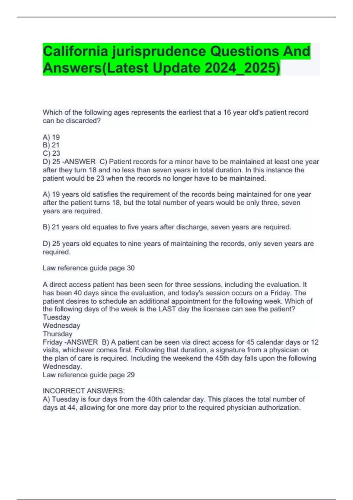 Which of the following ages represents the earliest that a 16 year old's patient record can be discarded? A) 19 B) 21 C) 23 D) 25 -ANSWER C) Patient records for a minor have to be maintained at least one year after they turn 18 and no less than seven years in total duration. In this instance the patient would be 23 when the records no longer have to be maintained. A) 19 years old satisfies the requirement of the records being maintained for one year after the patient turns 18, but the total number of years would be only three, seven years are required. B) 21 years old equates to five years after discharge, seven years are required. D) 25 years old equates to nine years of maintaining the records, only seven years are required. Law reference guide page 30 A direct access patient has been seen for three sessions, including the evaluation. It has been 40 days since the evaluation, and today's session occurs on a Friday. The patient desires to schedule an additional appointment for the following week. Which of the following days of the week is the LAST day the licensee can see the patient? Tuesday Wednesday Thursday Friday -ANSWER B) A patient can be seen via direct access for 45 calendar days or 12 visits, whichever comes first. Following that duration, a signature from a physician on the plan of care is required. Including the weekend the 45th day falls upon the following Wednesday. Law reference guide page 29 INCORRECT ANSWERS: A) Tuesday is four days from the 40th calendar day. This places the total number of days at 44, allowing for one more day prior to the required physician authorization. C) Thursday is six days from the 40th calendar day. This places the total number of days at 46, which exceeds what is allowed prior to having to obtain physician authorization. D) Friday is seven days from the 40th calendar day. This places the total number of days at 47, which exceeds what is allowed prior to having to obtain physician authorization. Law reference guide page 29 What governing body is responsible for the suspension of physical therapy licenses? A) PTBC B) ABPTS C) FSBPT D) IRB -ANSWER
