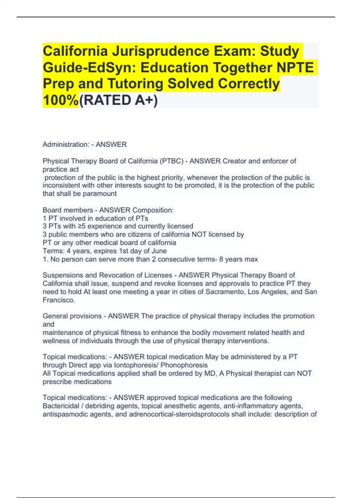 California Jurisprudence Exam: Study Guide-EdSyn: Education Together NPTE Prep and Tutoring Solved Correctly 100%(RATED A+)