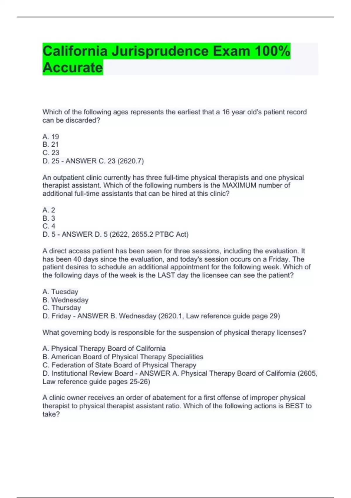 Which of the following ages represents the earliest that a 16 year old's patient record can be discarded? A. 19 B. 21 C. 23 D. 25 - ANSWER C. 23 (2620.7) An outpatient clinic currently has three full-time physical therapists and one physical therapist assistant. Which of the following numbers is the MAXIMUM number of additional full-time assistants that can be hired at this clinic? A. 2 B. 3 C. 4 D. 5 - ANSWER D. 5 (2622, 2655.2 PTBC Act) A direct access patient has been seen for three sessions, including the evaluation. It has been 40 days since the evaluation, and today's session occurs on a Friday. The patient desires to schedule an additional appointment for the following week. Which of the following days of the week is the LAST day the licensee can see the patient? A. Tuesday B. Wednesday C. Thursday D. Friday - ANSWER B. Wednesday (2620.1, Law reference guide page 29) What governing body is responsible for the suspension of physical therapy licenses? A. Physical Therapy Board of California B. American Board of Physical Therapy Specialities C. Federation of State Board of Physical Therapy D. Institutional Review Board - ANSWER A. Physical Therapy Board of California (2605, Law reference guide pages 25-26) A clinic owner receives an order of abatement for a first offense of improper physical therapist to physical therapist assistant ratio. Which of the following actions is BEST to take? A. Payment of a $5,000 fee for non compliance with the correction to be made within 6 months of the payment date B. Make a written request for an extension to implement corrections if not able to make the changes within the timeframe specified by the board C. Provide documented evidence and support as to why the improper ratio exists D. Acknowledge the improper ratio as a first offense and established warning - ANSWER B. Make a written request for an extension to implement corrections if not able to make the changes within the timeframe specified by the board (1399.27, Law reference guide page 98) To discuss patient care with the therapist of record, it is BEST to talk with the physical therapist who: