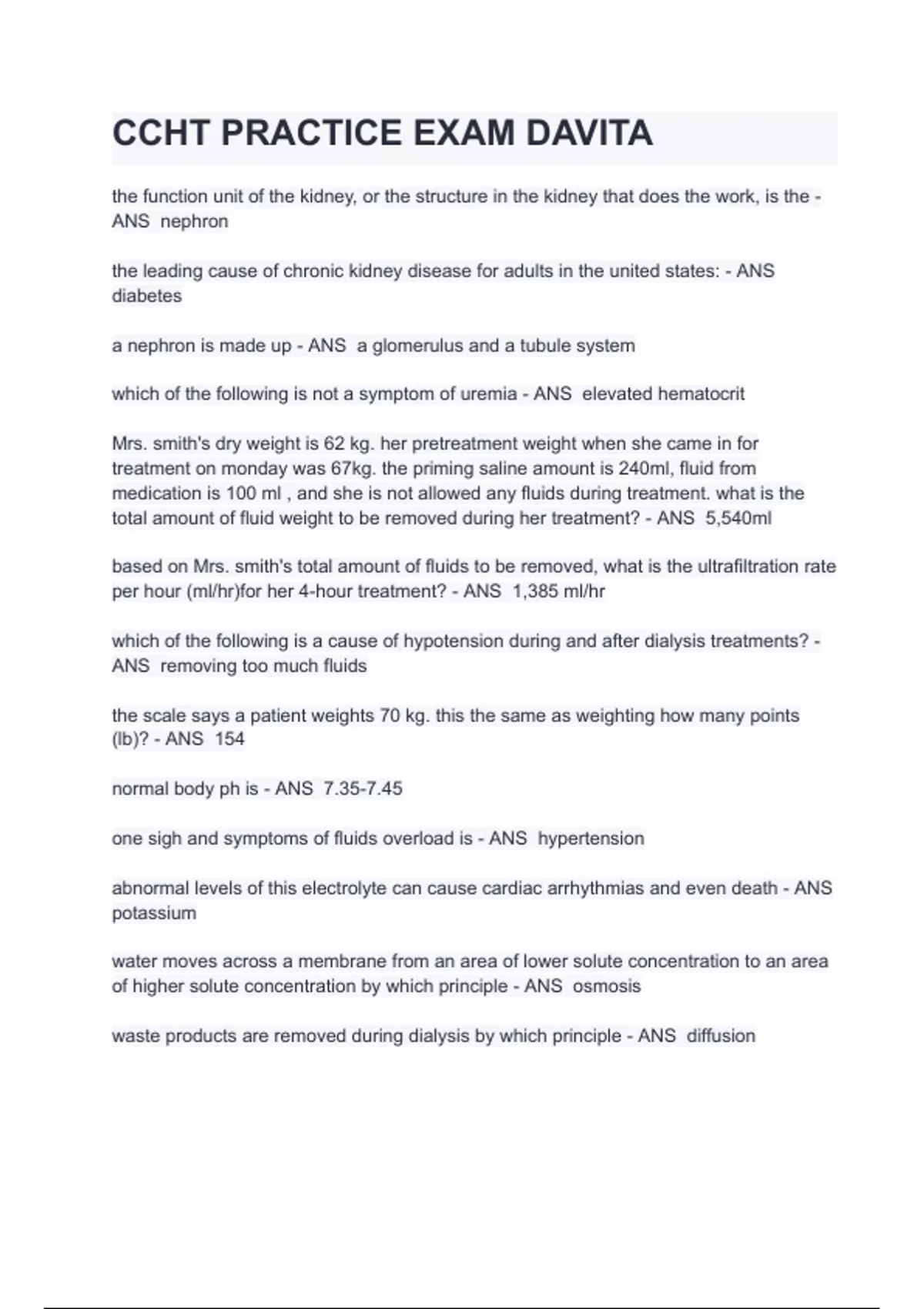 CCHT PRACTICE EXAM DAVITA 2023 Questions and Answers (Verified Answers) the function unit of the kidney, or the structure in the kidney that does the work, is the - ANS nephron the leading cause of chronic kidney disease for adults in the united states: - ANS diabetes a nephron is made up - ANS a glomerulus and a tubule system which of the following is not a symptom of uremia - ANS elevated hematocrit Mrs. smith's dry weight is 62 kg. her pretreatment weight when she came in for treatment on monday was 67kg. the priming saline amount is 240ml, fluid from medication is 100 ml , and she is not allowed any fluids during treatment. what is the total amount of fluid weight to be removed during her treatment? - ANS 5,540ml based on Mrs. smith's total amount of fluids to be removed, what is the ultrafiltration rate per hour (ml/hr)for her 4-hour treatment? - ANS 1,385 ml/hr which of the following is a cause of hypotension during and after dialysis treatments? - ANS removing too much fluids the scale says a patient weights 70 kg. this the same as weighting how many points (lb)? - ANS 154 normal body ph is - ANS 7.35-7.45 one sigh and symptoms of fluids overload is - ANS hypertension abnormal levels of this electrolyte can cause cardiac arrhythm