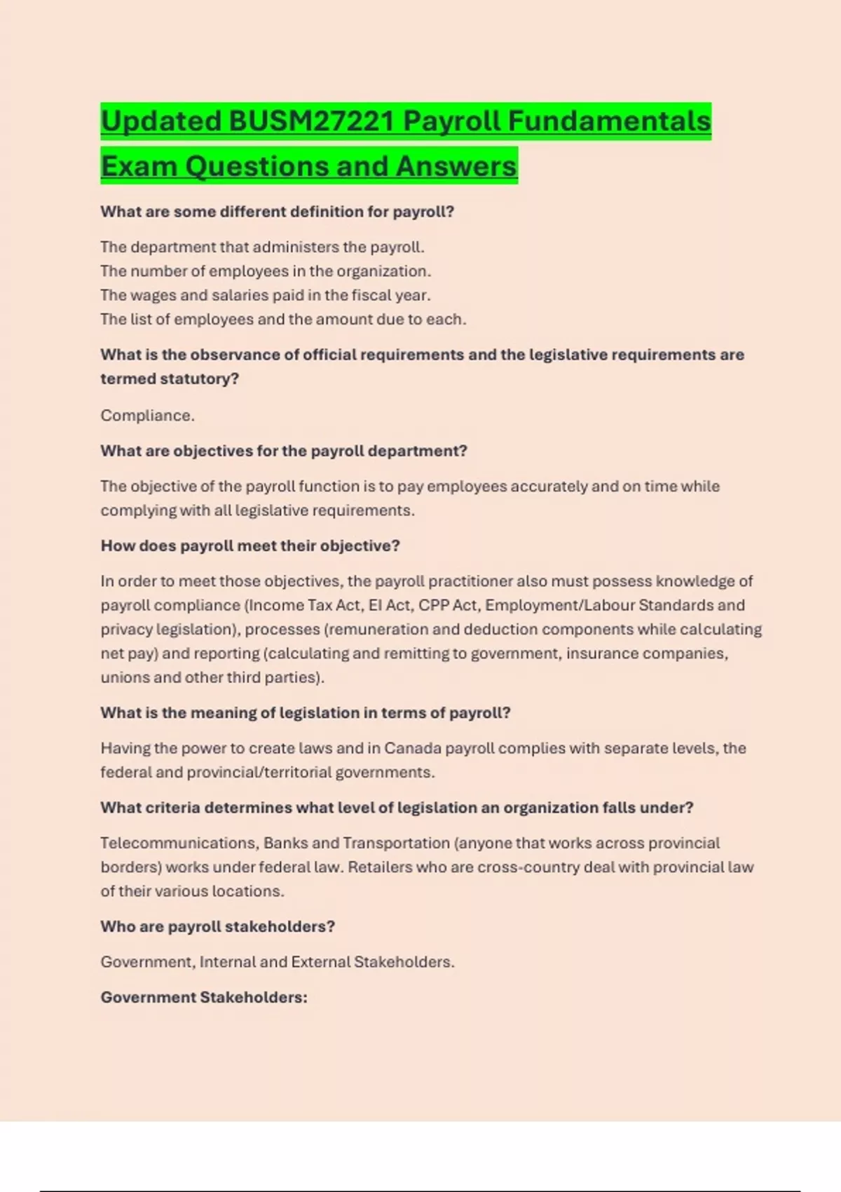 Updated BUSM27221 Payroll Fundamentals Exam Questions and Answers