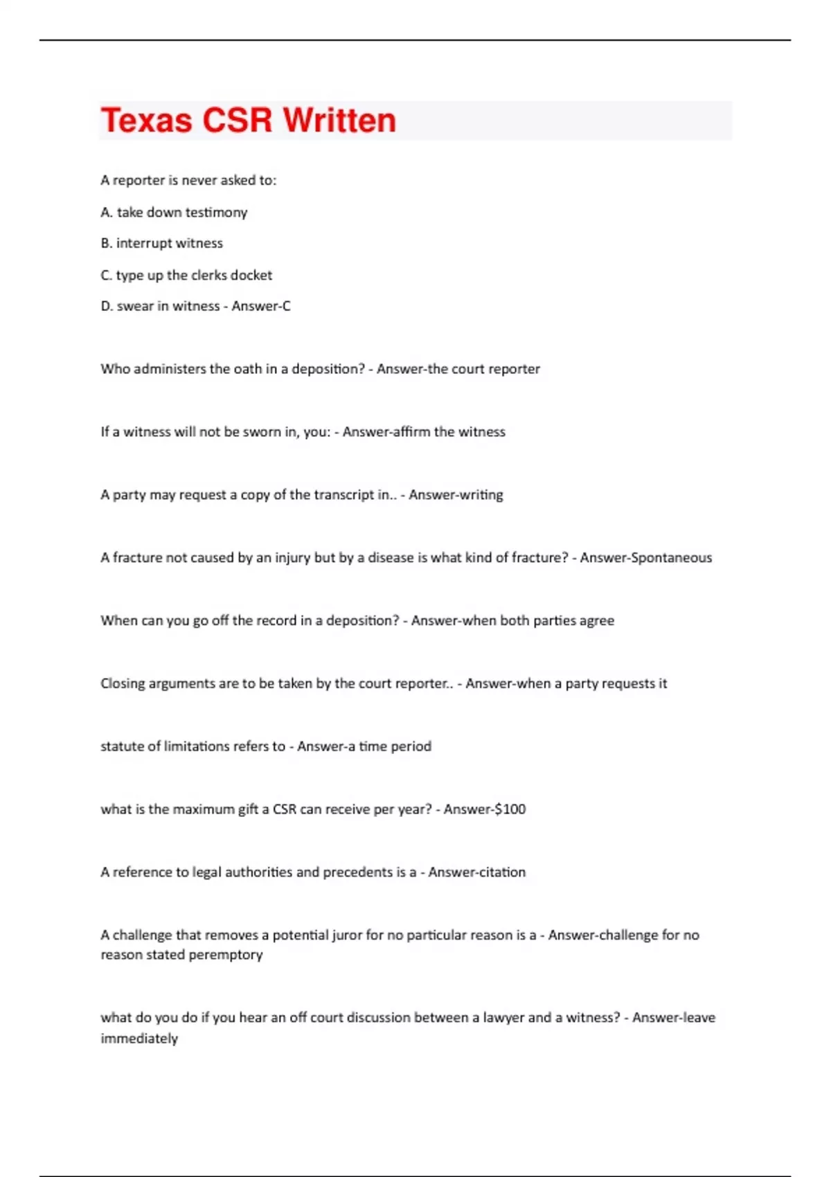 A reporter is never asked to: A. take down testimony B. interrupt witness C. type up the clerks docket D. swear in witness - Answer-C Who administers the oath in a deposition? - Answer-the court reporter If a witness will not be sworn in, you: - Answer-affirm the witness A party may request a copy of the transcript in.. - Answer-writing A fracture not caused by an injury but by a disease is what kind of fracture? - Answer-Spontaneous When can you go off the record in a deposition? - Answer-when both parties agree Closing arguments are to be taken by the court reporter.. - Answer-when a party requests it statute of limitations refers to - Answer-a time period what is the maximum gift a CSR can receive per year? - Answer-$100 A reference to legal authorities and precedents is a - Answer-citation A challenge that removes a potential juror for no particular reason is a - Answer-challenge for no reason stated peremptory what do you do if you hear an off court discussion between a lawyer and a witness? - Answer-leave immediatelythe place to look up the spelling of a prominent american is in - Answer-Who's who Which of the following is a plea? A. guilty B. not guilty C. nolo contendere D. all of the above - Answer-D a CSR's licence is valid for how long? - Answer-2 years in criminal cases, how does the judge answer questions presented him by the jury? - Answer-in open court recorded by the court reporter A reporter's transcript shall be filed in the appellate court within - Answer-60 days Inaccuracies in a statement of facts may be corrected by - Answer-the agreement of both parties or by the county ethics committee When a legal decision is based on precedent, it is based on - Answer-set laws A volume of a statement of facts is limited to how many inches in thickness? - Answer-2 inches 52.026d: A person whose certification has been expired for 90 days or less may renew the certification by paying a renewal fee that is equal to _______ times the normal renewal fee. - Answer-1 and a half 52.026e: A person whose certification has been expired for more than 90 days but less than one year may renew the certification by paying a renewal free that is equal to _____ times the normal renewal fee. - Answer-2 52.026f: A person whose certification has been expired for _____ or more may not renew the certification. - Answer-1 year52.026h: Not later than the ____ day before the date a person's certification is scheduled to expire, the board shall send a written notification of the impending expiration to the person's last known address. - Answer-30th How many spaces make up a tab? - Answer-5