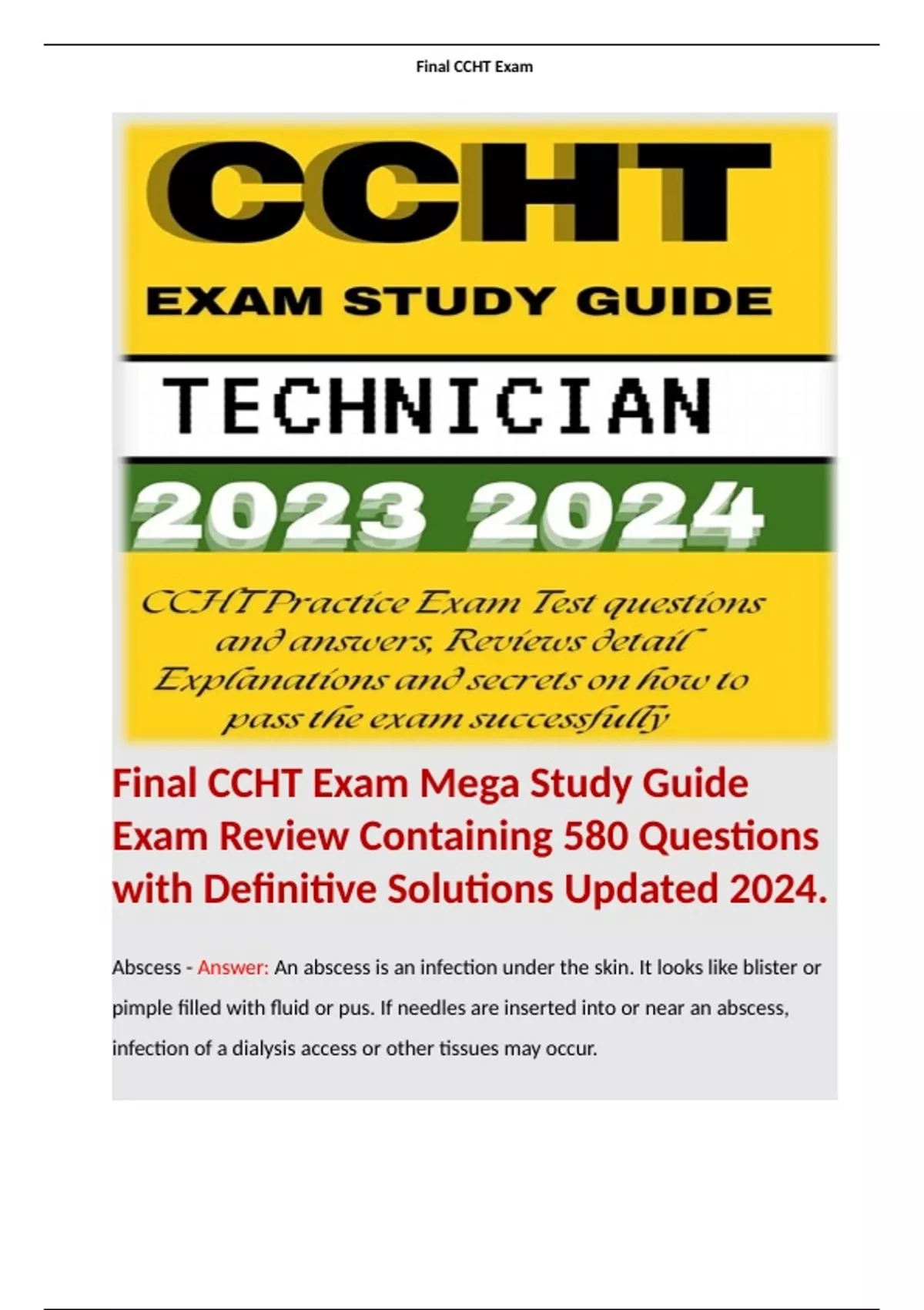 Final CCHT Exam Mega Study Guide Exam Review Containing 580 Questions with Definitive Solutions Updated 2024. Contains terms like: Abscess - Answer: An abscess is an infection under the skin. It looks like blister or pimple filled with fluid or pus. If needles are inserted into or near an abscess, infection of a dialysis access or other tissues may occur.