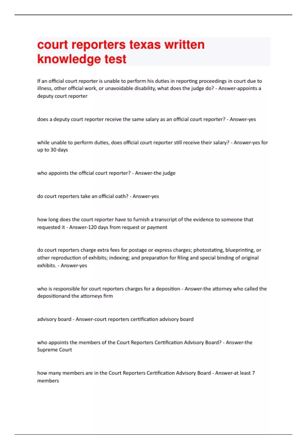 If an official court reporter is unable to perform his duties in reporting proceedings in court due to illness, other official work, or unavoidable disability, what does the judge do? - Answer-appoints a deputy court reporter does a deputy court reporter receive the same salary as an official court reporter? - Answer-yes while unable to perform duties, does official court reporter still receive their salary? - Answer-yes for up to 30 days who appoints the official court reporter? - Answer-the judge do court reporters take an official oath? - Answer-yes how long does the court reporter have to furnish a transcript of the evidence to someone that requested it - Answer-120 days from request or payment do court reporters charge extra fees for postage or express charges; photostating, blueprinting, or other reproduction of exhibits; indexing; and preparation for filing and special binding of original exhibits. - Answer-yes who is responsible for court reporters charges for a deposition - Answer-the attorney who called the depositionand the attorneys firm advisory board - Answer-court reporters certification advisory board who appoints the members of the Court Reporters Certification Advisory Board? - Answer-the Supreme Court how many members are in the Court Reporters Certification Advisory Board - Answer-at least 7 memberswhat to the members of the Court Reporters Certification Advisory Board Consist of - Answer-1 active District Judge 1 active attorney 2 active official court reporters 2 active shorthand reporters 1 representative of a shorthand reporting firm what terms to members of Court Reporters Advisory Board serve - Answer-members serve staggered six year terms do members of court reporters advisory board get paid? - Answer-no are members of court reporters advisory board entitled to travel reimbursement and other necessary expenses? - Answer-yes can an apprentice court reporter serve as a shorthand reporter - Answer-yes, with approval how fast is Q & A dictation on Part A? - Answer-225 WPM how fast is Jury Charge dictation on Part A? - Answer-200 WPM how fast is literary dictation of Part A? - Answer-180 WPM what score do you need to pass part A - Answer-95% can you use a dictionary during part a - Answer-yes what score do you need to pass part b - Answer-75% can a CSR administer oaths in the state they are certified? - Answer-yes