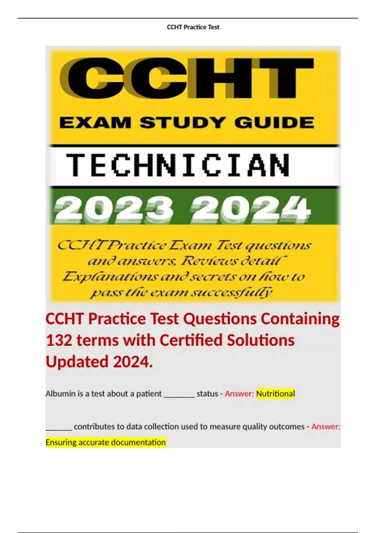 CCHT Practice Test Questions Containing 132 terms with Certified Solutions Updated 2024. Terms like: Albumin is a test about a patient _______ status - Answer: Nutritional