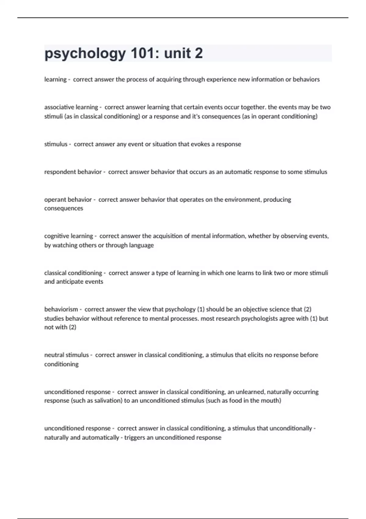 psychology 101: unit 2learning - correct answer the process of acquiring through experience new information or behaviors associative learning - correct answer learning that certain events occur together. the events may be two stimuli (as in classical conditioning) or a response and it's consequences (as in operant conditioning) stimulus - correct answer any event or situation that evokes a response respondent behavior - correct answer behavior that occurs as an automatic response to some stimulus operant behavior - correct answer behavior that operates on the environment, producing consequences cognitive learning - correct answer the acquisition of mental information, whether by observing events, by watching others or through language classical conditioning - correct answer a type of learning in which one learns to link two or more stimuli and anticipate events behaviorism - correct answer the view that psychology (1) should be an objective science that (2) studies behavior without reference to mental processes. most research psychologists agree with (1) but not with (2) neutral stimulus - correct answer in classical conditioning, a stimulus that elicits no response before conditioning unconditioned response - correct answer in classical conditioning, an unlearned, naturally occurring response (such as salivation) to an unconditioned stimulus (such as food in the mouth) unconditioned response - correct answer in classical conditioning, a stimulus that unconditionally - naturally and automatically - triggers an unconditioned response