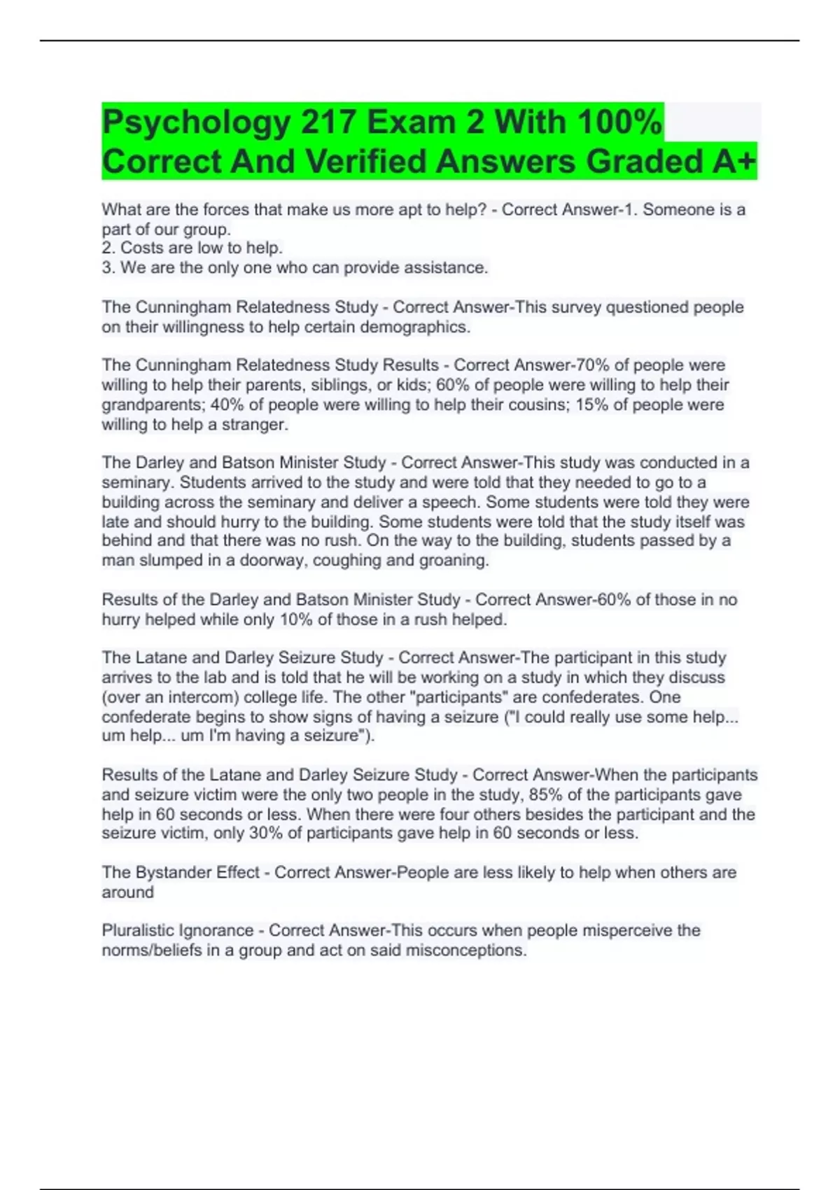Psychology 217 Exam 2 With 100% Correct And Verified Answers Graded A+