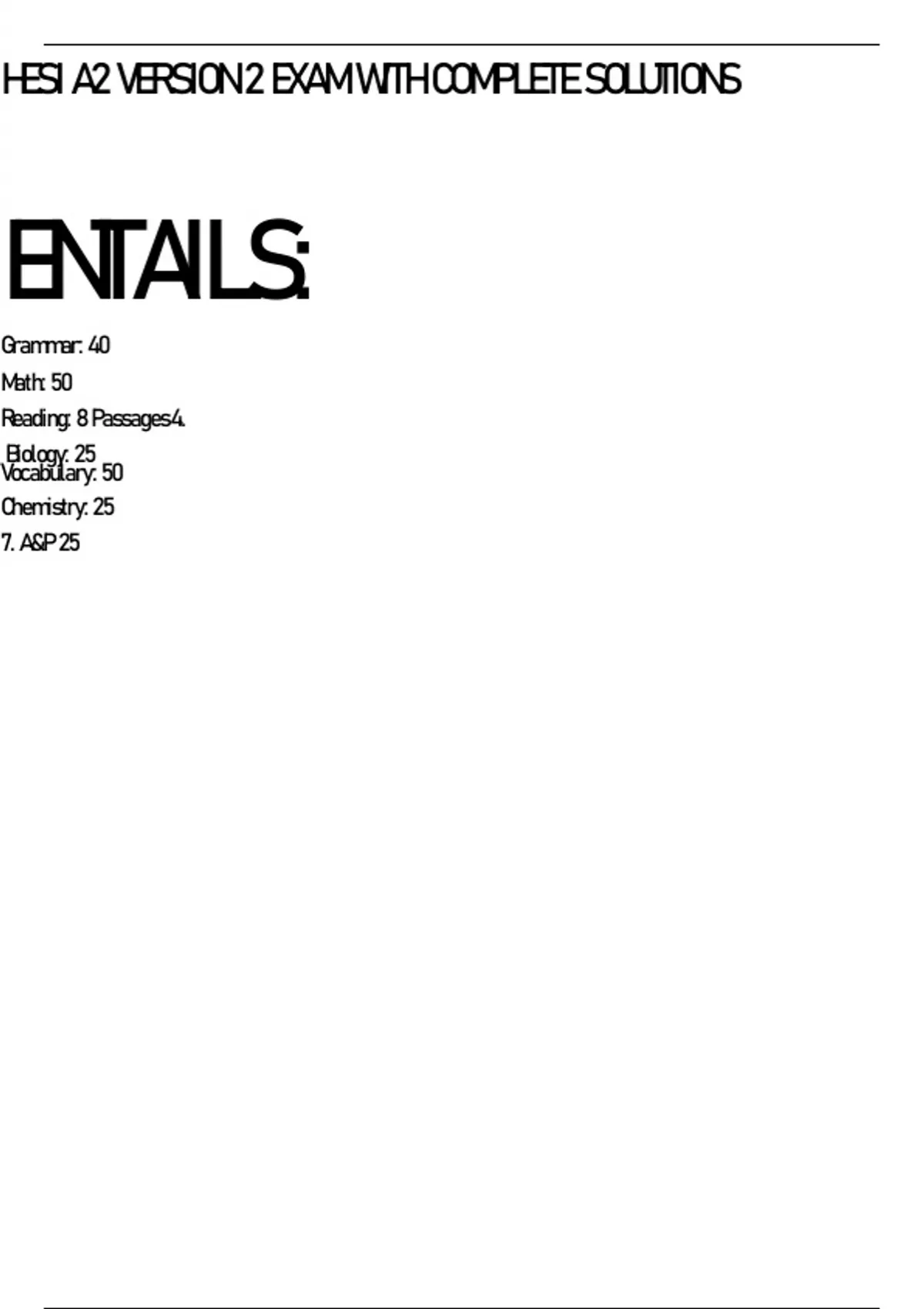 HESI A2 VERSION 2 EXAM WITH COMPLETE SOLUTIONS ENTAILS: Grammar: 40 Math: 50 Reading: 8 Passages 4. Biology: 25 Vocabulary: 50 Chemistry: 25 7. A&P 25 READING COMPREHENSION A nanometer is a billionth of a meter. A DNA molecule is 2 nanometers in diameter. Protein molecules are about 10 nanometers in diameter. A human hair is 100,000 nanometers in diameter. But what is a nanometer and how does it relate to technology? Nanotechnology is defined as the understanding and control of matter at dimensions of roughly 1 to 100 nanometers, a scale at which unique properties of materials emerge that can be used to develop novel technologies and products. At the nanoscale, the physical, chemical, and biological properties of materials differ from the properties of matter either at smaller scales, such as atoms, or at larger scales that we use in everyday life such as millimeters or inches. Nanotechnology involves imaging, measuring, modeling, and manipulating matter only a few nanometers in size. Gold nanoparticles are made of the same material as in jewelry. But when light interacts with particles of gold, different colors are reflected. The different colors can be used in simple medical tests to indicate infection or disease. Metals such as copper become extremely rigid at the nanoscale, rather than bendable as in copper wires seen in everyday use. What is the major difference between matter at the nanoscale and matter at larger scales such as millimeters or inches? A. At the nanoscale, metals are bendable, and at larger scales they are rigid. B. Matter has different and special characteristics at the nanoscale. C. At the nanoscale, matter has the same properties as matter at the atomic level. D. There is no difference. Which claim from the passage best describes the benefits of nanotechnology? A. Scientists can develop novel technologies and products. B. Nanotechnology is defined as the understanding and control of matter at dimensions of roughly 1 to 100 nanometers. C. The different colors can be used in simple medical tests to indicate infection or disease. D. Unique properties of materials emerge. What is the author’s primary purpose in writing this essay? A. To explain how to utilize the nanoscale B. To review the conversion between the nanoscale and nanotechnology C. To advocate for the usage of more nanotechnology D. To describe nanotechnology and what it is Neurologists and biological psychologists have witnessed a sharp increase in the knowledge and understanding of particular structures of the brain over the past two decades. As technology becomes ever more advanced, scientists are able to isolate the functions of even small regions of the human brain. One noteworthy discovery is the role of the amygdala in human fear and aggression. The amygdala, a small, almond-shaped conglomerate, is just one part of the limbic system. Located at the very center of the brain, the limbic system is the core of our 'emotional brain;' each individual structure in the limbic system is somehow connected to an aspect of human emotion. Scientists have found that electrode stimulation of the amygdala can elicit extreme and aggressive acts. Patients or experimental subjects who experience this utter rage and fearlessness have no rational foundation for their reaction. In other words, this aggression is wholly attributable to electrode stimulation. On the other hand, patients with trauma or damage to this structure exhibit a complete absence of aggression. Researchers find that no amount of poking, prodding or harassment will evoke even remotely aggressive responses from these subjects. The author suggests that persistent passivity and imperturbability may be a direct result of which of the following? A. Drug-induced stimulation of the amygdala. B. A stroke that resulted in severe tissue damage in the limbic system C. Encephalitis as a result of head trauma D. Activation of a strategically implanted electrode in a patient’s amygdala. Which statement is not listed as a detail within the passage? A. Electrode stimulation of the amygdala can elicit extreme aggressive acts. B. Scientists are able to isolate the functions of even small regions of the human brain. C. Typically, temperamental rhesus monkeys with amygdala damage are completely imperturbable. D. Subjects who experience this utter rage and fearlessness have no rational foundation for their reaction. What is the main idea of the passage? A. The human brain is as complex as it is mysterious. B. Patients with damaged amygdalas are less aggressive than individuals with healthy ones. C. Electrode stimulation is a valuable tool for researchers who study the human brain. D. Scientists have learned a lot about how the amygdala affects human emotion. The ability to see at a distance, in good light, does not diminish as a result of aging to the extent that other visual acuities do. Myopia, or nearsightedness, is more common to younger eyes, while presbyopia, or farsightedness, more commonly afflicts people as they age. The word presbyopia comes from Greek presbys, "old man," and opia, "eye," and names a condition in which, because the lens of the eye hardens slightly and loses elasticity as a person ages, one cannot as easily focus sharply on nearby objects. This condition leads to the familiar habit of lifting up one's glasses and bringing an object or reading material close to the face so that the eyes can more easily focus on it. The function of the lens is to accommodate different focal points so that sensory data can be correctly directed to the retina for interpretation into images by the brain. Corrective lenses, particularly bifocals or progressive lenses, adjust for the focal point aberration. In essence, they do the work that the eye can no longer do for itself. In the context of the passage, “accommodate” means to A. Arrange lodging for B. Contain C. Make allowances for D. Excuse The author of the passage would probably agree with which of the fo