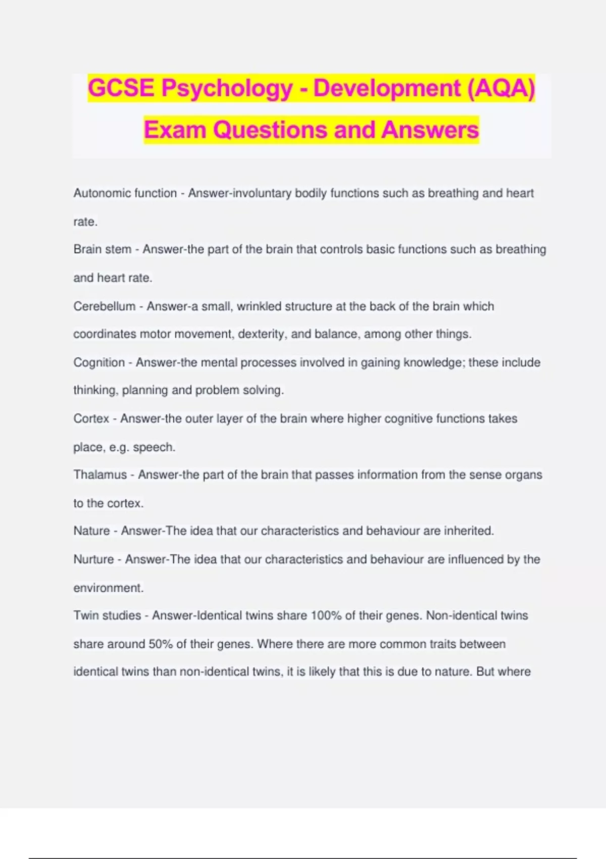 GCSE Psychology - Development (AQA) Exam Questions and Answers Autonomic function - Answer-involuntary bodily functions such as breathing and heart rate. Brain stem - Answer-the part of the brain that controls basic functions such as breathing and heart rate. Cerebellum - Answer-a small, wrinkled structure at the back of the brain which coordinates motor movement, dexterity, and balance, among other things. Cognition - Answer-the mental processes involved in gaining knowledge; these include thinking, planning and problem solving. Cortex - Answer-the outer layer of the brain where higher cognitive functions takes place, e.g. speech. Thalamus - Answer-the part of the brain that passes information from the sense organs to the cortex. Nature - Answer-The idea that our characteristics and behaviour are inherited. Nurture - Answer-The idea that our characteristics and behaviour are influenced by the environment. Twin studies - Answer-Identical twins share 100% of their genes. Non-identical twins share around 50% of their genes. Where there are more common traits between identical twins than non-identical twins, it is likely that this is due to nature. But where their are common traits between all twins that have been raised in the same environment then this is likely to be due to nurture. Newborn baby studies - Answer-Newborn baby studies are important as there will be very little nurture impacting the baby before birth. Psychologists have found that besides being able to cry, newborn babies can also recognise faces. This means that nature is responsible for these abilities. As babies are not able to talk much later on, it is believed that nurture is responsible for language development. Animal studies - Answer-Baby rats were kept in cages on their own with no toys. Another group of baby rats were kept in cages together with a lot of stimulating toys. The rats then lived in the group in the stimulating environment development bigger brains and demonstrated better problem solving skills than the rats that lived on their own. This supports the idea that nurture is very important for early brain development. Cognitive development - Answer-All of the things that go on inside your brain, including perception, thinking, memory, attention, language, problem-solving, and learning. Schemas - Answer-Blocks of knowledge that develop in response to our experiences of the world. Assimilation - Answer-When new information is added to an existing schema. Accommodation - Answer-Changing a schema, or developing new schema to cope with new situations Concrete operational - Answer-The ability to apply logic to physical (concrete) objects to solve problems Conservation - Answer-Knowing that the amount of something stays the same, even though its appearance might change Egocentric - Answer-Not being able to see things from another's point of view Pre-operational - Answer-Before log