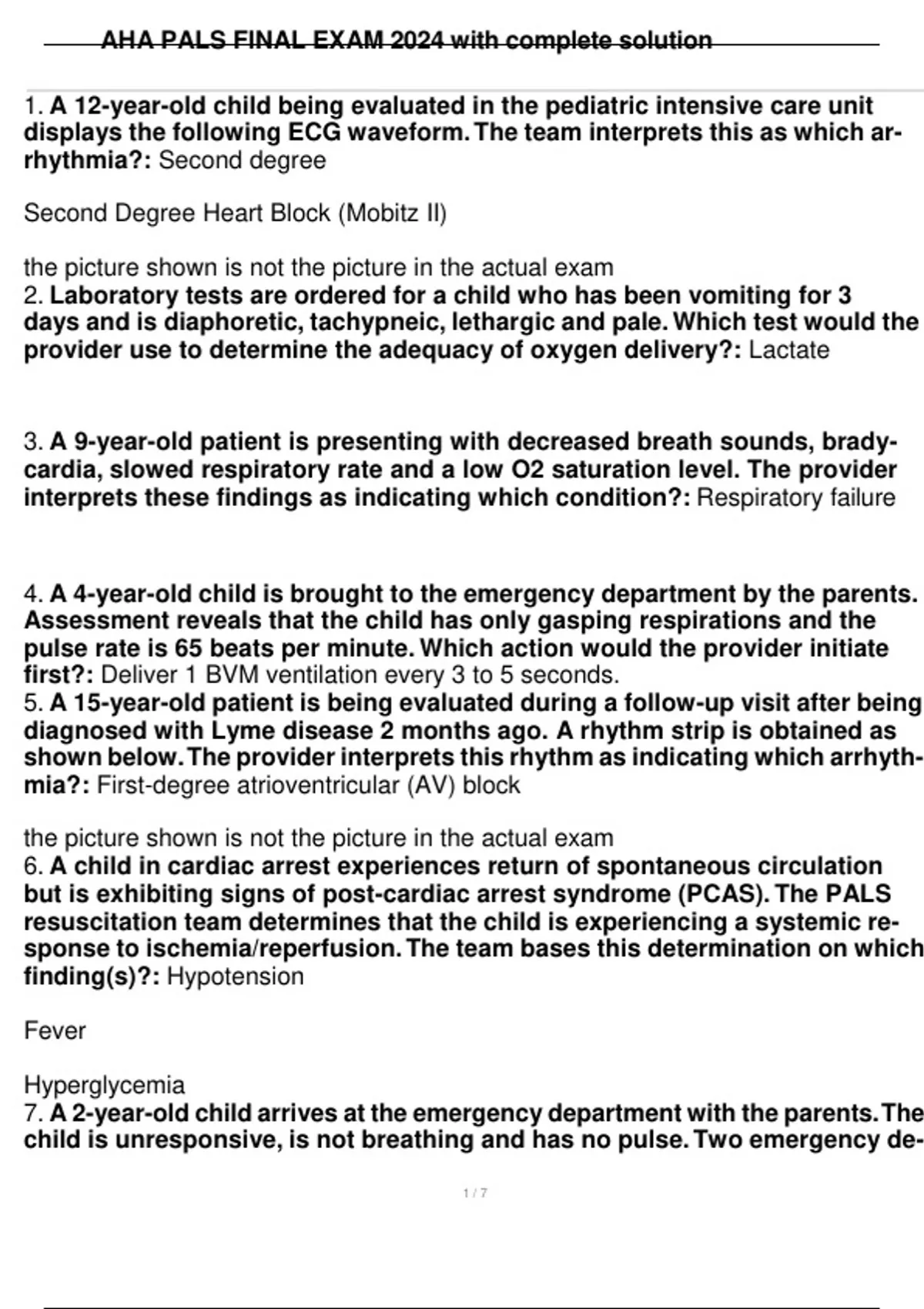 1. A 12-year-old child being evaluated in the pediatric intensive care unit displays the following ECG waveform. The team interprets this as which ar- rhythmia?: Second degree Second Degree Heart Block (Mobitz II) the picture shown is not the picture in the actual exam 2. Laboratory tests are ordered for a child who has been vomiting for 3 days and is diaphoretic, tachypneic, lethargic and pale. Which test would the provider use to determine the adequacy of oxygen delivery?: Lactate 3. A 9-year-old patient is presenting with decreased breath sounds, brady- cardia, slowed respiratory rate and a low O2 saturation level. The provider interprets these findings as indicating which condition?: Respiratory failure 4. A 4-year-old child is brought to the emergency department by the parents. Assessment reveals that the child has only gasping respirations and the pulse rate is 65 beats per minute. Which action would the provider initiate first?: Deliver 1 BVM ventilation every 3 to 5 seconds. 5. A 15-year-old patient is being evaluated during a follow-up visit after being diagnosed with Lyme disease 2 months ago. A rhythm strip is obtained as shown below. The provider interprets this rhythm as indicating which arrhyth- mia?: First-degree atrioventricular (AV) block the picture shown is not the picture in the actual exam 6. A child in cardiac arrest experiences return of spontaneous circulation but is exhibiting signs of post-cardiac arrest syndrome (PCAS). The PALS resuscitation team determines that the child is experiencing a systemic re- sponse to ischemia/reperfusion. The team bases this determination on which finding(s)?: Hypotension Fever Hyperglycemia 7. A 2-year-old child arrives at the emergency department with the parents. The child is unresponsive, is not breathing and has no pulse. Two emergency de-