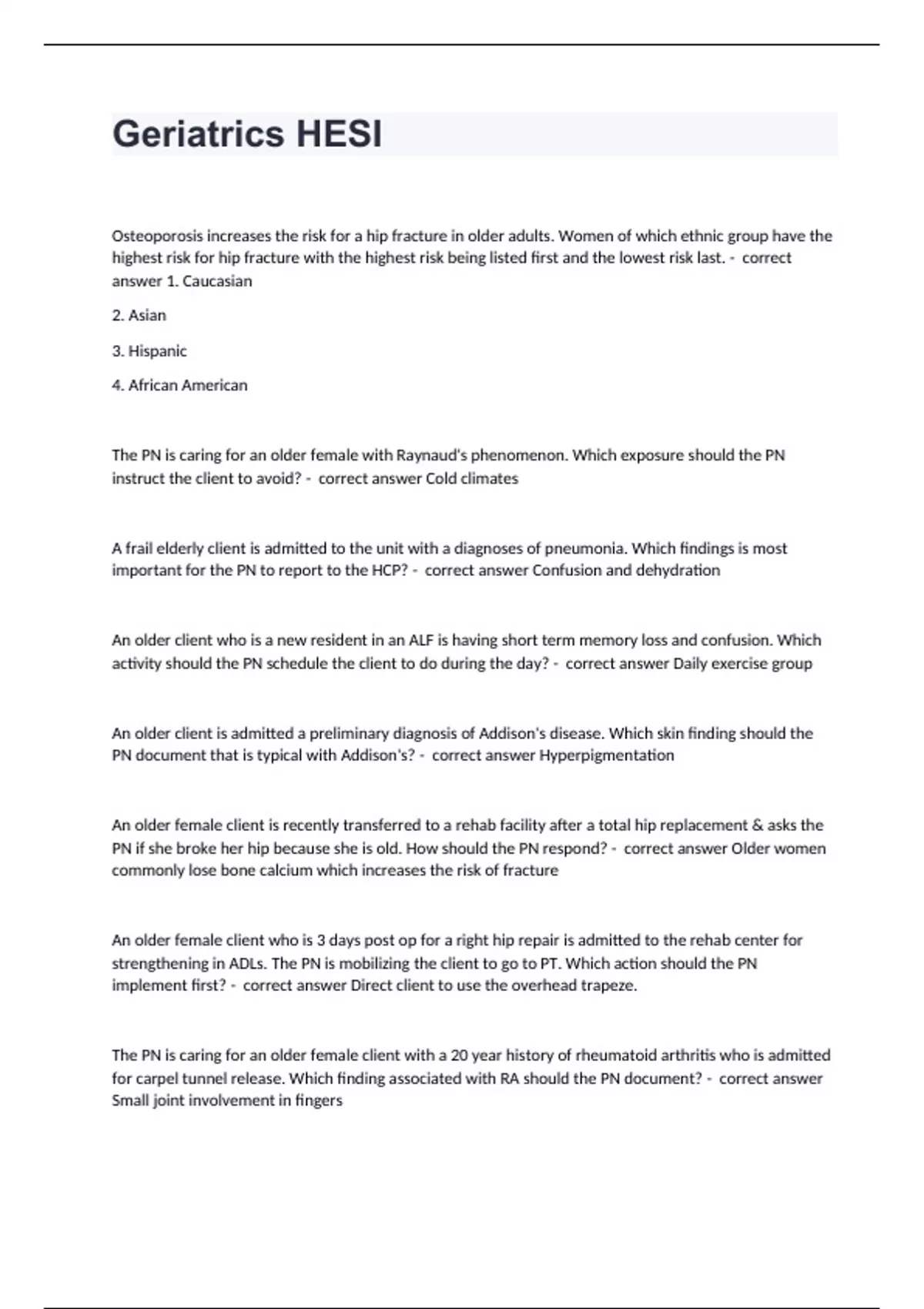 Geriatrics HESIOsteoporosis increases the risk for a hip fracture in older adults. Women of which ethnic group have the highest risk for hip fracture with the highest risk being listed first and the lowest risk last. - correct answer 1. Caucasian 2. Asian 3. Hispanic 4. African American The PN is caring for an older female with Raynaud's phenomenon. Which exposure should the PN instruct the client to avoid? - correct answer Cold climates A frail elderly client is admitted to the unit with a diagnoses of pneumonia. Which findings is most important for the PN to report to the HCP? - correct answer Confusion and dehydration An older client who is a new resident in an ALF is having short term memory loss and confusion. Which activity should the PN schedule the client to do during the day? - correct answer Daily exercise group An older client is admitted a preliminary diagnosis of Addison's disease. Which skin finding should the PN document that is typical with Addison's? - correct answer Hyperpigmentation An older female client is recently transferred to a rehab facility after a total hip replacement & asks the PN if she broke her hip because she is old. How should the PN respond? - correct answer Older women commonly lose bone calcium which increases the risk of fracture An older female client who is 3 days post op for a right hip repair is admitted to the rehab center for strengthening in ADLs. The PN is mobilizing the client to go to PT. Which action should the PN implement first? - correct answer Direct client to use the overhead trapeze. The PN is caring for an older female client with a 20 year history of rheumatoid arthritis who is admitted for carpel tunnel release. Which finding associated with RA should the PN document? - correct answer Small joint involvement in fingers