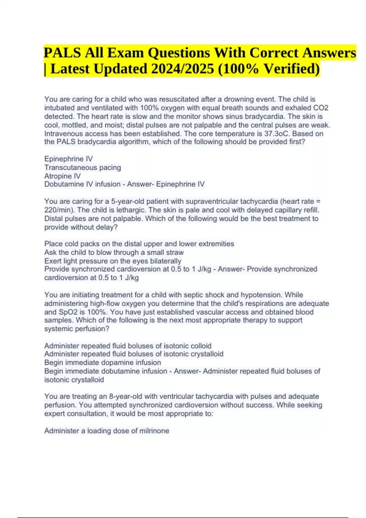 PALS All Exam Questions With Correct Answers | Latest Updated 2024/2025 (100% Verified) You are caring for a child who was resuscitated after a drowning event. The child is intubated and ventilated with 100% oxygen with equal breath sounds and exhaled CO2 detected. The heart rate is slow and the monitor shows sinus bradycardia. The skin is cool, mottled, and moist; distal pulses are not palpable and the central pulses are weak. Intravenous access has been established. The core temperature is 37.3oC. Based on the PALS bradycardia algorithm, which of the following should be provided first? Epinephrine IV Transcutaneous pacing Atropine IV Dobutamine IV infusion - Answer- Epinephrine IV You are caring for a 5-year-old patient with supraventricular tachycardia (heart rate = 220/min). The child is lethargic. The skin is pale and cool with delayed capillary refill. Distal pulses are not palpable. Which of the following would be the best treatment to provide without delay? Place cold packs on the distal upper and lower extremities Ask the child to blow through a small straw Exert light pressure on the eyes bilaterally Provide synchronized cardioversion at 0.5 to 1 J/kg - Answer- Provide synchronized cardioversion at 0.5 to 1 J/kg You are initiating treatment for a child with septic shock and hypotension. While administering high-flow oxygen you determine that the child's respirations are adequate and SpO2 is 100%. You have just established vascular access and obtained blood samples. Which of the following is the next most appropriate therapy to support systemic perfusion? Administer repeated fluid boluses of isotonic colloid Administer repeated fluid boluses of isotonic crystalloid Begin immediate dopamine infusion Begin immediate dobutamine infusion - Answer- Administer repeated fluid boluses of isotonic crystalloid You are treating an 8-year-old with ventricular tachycardia with pulses and adequate perfusion. You attempted synchronized cardioversion without success. While seeking expert consultation, it would be most appropriate to: Administer a loading dose of milrinone PALS All Exam Questions With Correct Answers | Latest Updated 2024/2025 (100% Verified) Consider possible metabolic and toxicologic causes Initiate overdrive pacing transcutaneously Deliver an unsynchronized shock - Answer- Consider possible metabolic and toxicologic causes You are caring for a 2-year-old unconscious patient who is intubated and receiving mechanical ventilation. The child's heart rate suddenly drops to 40/min and his color becomes mottled. You should respond to these changes by: Increasing the ventilator rate Increasing tidal volume Increasing positive end-expiratory pressure (PEEP) Using a resuscitation bag provide manual ventilation with 100% oxygen - Answer- Using a resuscitation bag provide manual ventilation with 100% oxygen You are caring for a 9-month-old patient with pronounced respiratory distress. You initiated high-flow oxygen using a nonrebreathing mask about 10 minutes ago and established intravenous access. Initially the infant's heart rate was in the 150/min range with strong pulses. Suddenly the infant's respiratory rate falls to 6/min with significant intercostals retractions, and little air movement is heard. The infant becomes cyanotic and the heart rate decreases to 95/min. Which of the following treatments would be best for you to provide now? Administer epinephrine IV Provide bag-mask ventilation Administer magnesium sulfate IV Intubate and ventilate - Answer- Provide bag-mask ventilation Which of the following is likely to be the most helpful technique to identify potentially reversible metabolic and toxic causes during the attempted resuscitation of a young child in cardiac arrest? Obtaining a urine sample for toxicology screen Obtaining chest and abdominal radiographs Soliciting a history from the caregiver or family Obtaining a venous blood gas - Answer- Soliciting a history from the caregiver or family You are caring for a patient who developed a tension pneumothorax after several hours of positive-pressure ventilation. Which of the following would be the most appropriate site for needle decompression? Over the third rib at the midclavicular line Under the eighth rib at the midaxillary line Over the fifth rib at the sternal border Under the sixth rib at the midclavicular line - Answer- Over the third rib at the midclavicular line You attempted synchronized cardioversion for an infant with supraventricular tachycardia (SVT) and poor perfusion. The SVT persists after the initial 1 J/kg shock. Which of the following should you attempt now? Synchronized cardioversion at a dose of 2 J/kg Synchronized cardioversion at a dose of 4 J/kg Unsynchronized cardioversion at a dose of 2 J/kg Unsynchronized cardioversion at a dose of 4 J/kg - Answer- Synchronized cardioversion at a dose of 2 J/kg You are treating a 5-month-old with a 2-day history of vomiting and diarrhea. The patient is listless. The respiratory rate is 52/min and unlabored. The heart rate is 170/min and pulses are present but weak. Capillary refill is delayed. You are administering high-flow oxygen, and intravenous access is in place. At this point the most important therapy is to: Administer an epinephrine bolus Begin bag-mask ventilation Provide a rapid 20 ml/kg isotonic crystalloid fluid bolus Administer a bolus of 0.5 g/kg of dextrose - Answer- Provide a rapid 20 ml/kg isotonic crystalloid fluid bolus Which of the following groups of clinical findings would be most consistent with categorizing a patient with compensated shock? Normal systolic blood pressure, decreased level of consciousness, cool extremities with delayed capillary refill, and faint or nonpalpable distal pulses Decreased level of consciousness, extensor posturing in response to pain, hypertension, and apnea Normal blood pressure, normal level of consciousness, bounding distal pulses, hypercarbia, hypoxemia, and normal urine output Unresponsiveness, normal breat