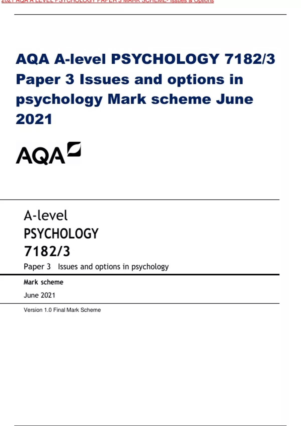 AQA A-level PSYCHOLOGY 7182/3 Paper 3 Issues and options in psychology Mark scheme June 2021 A-level PSYCHOLOGY 7182/3