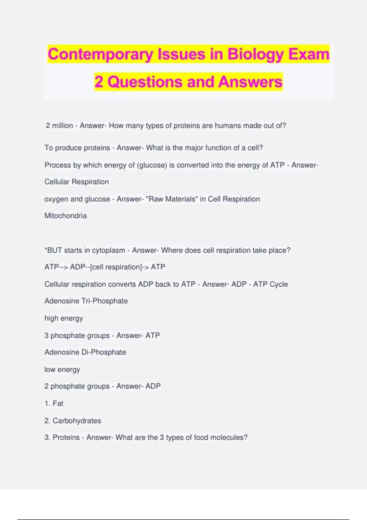 Contemporary Issues in Biology Exam 2 Questions and Answers 2 million - Answer- How many types of proteins are humans made out of? To produce proteins - Answer- What is the major function of a cell? Process by which energy of (glucose) is converted into the energy of ATP - Answer- Cellular Respiration oxygen and glucose - Answer- "Raw Materials" in Cell Respiration Mitochondria *BUT starts in cytoplasm - Answer- Where does cell respiration take place? ATP--> ADP--[cell respiration]-> ATP Cellular respiration converts ADP back to ATP - Answer- ADP - ATP Cycle Adenosine Tri-Phosphate high energy 3 phosphate groups - Answer- ATP Adenosine Di-Phosphate low energy 2 phosphate groups - Answer- ADP 1. Fat 2. Carbohydrates 3. Proteins - Answer- What are the 3 types of food molecules? mouth pharynx esophagus stomach small intestine large intestine rectum - Answer- Parts of Digestive Tract tube that passes through the body and the contents of the tube aren't actually "in" the body yet - Answer- What is the digestive tract? To break down food particles small enough to pass through walls of small intestine into bloodstream - Answer- Function of Digestive System 1. Salivary glands 2. Gastric glands 3. Pancreas 4. Liver 5. Small Intestine - Answer- Accessory Glands Mouth Amylase: carbs - Answer- Salivary Glands