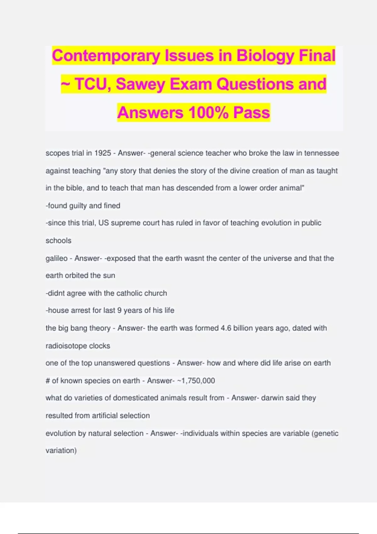 Contemporary Issues in Biology Final ~ TCU, Sawey Exam Questions and Answers 100% Pass scopes trial in 1925 - Answer- -general science teacher who broke the law in tennessee against teaching "any story that denies the story of the divine creation of man as taught in the bible, and to teach that man has descended from a lower order animal" -found guilty and fined -since this trial, US supreme court has ruled in favor of teaching evolution in public schools galileo - Answer- -exposed that the earth wasnt the center of the universe and that the earth orbited the sun -didnt agree with the catholic church -house arrest for last 9 years of his life the big bang theory - Answer- the earth was formed 4.6 billion years ago, dated with radioisotope clocks one of the top unanswered questions - Answer- how and where did life arise on earth # of known species on earth - Answer- ~1,750,000 what do varieties of domesticated animals result from - Answer- darwin said they resulted from artificial selection evolution by natural selection - Answer- -individuals within species are variable (genetic variation) -some variation passed on to offspring (heritable) -more offspring produced than can survive -survival and reproduction isnt random ingredients for evolution - Answer- -long time -genetic variability -agents of natural selection (disease, water, predators, temperature) --> extinction is evidence -inheritance of selected traits -anatomical evidence of common descent "lucy" - Answer- 3.2 million year old ancestor of humans; found in ethiopia in 1974 "ardi" - Answer- breakthrough in 2009; 4.4 million year old human ancestory; found in ethiopia how long have homo-sapiens been on earth - Answer- thought to be 200,000 years, starting in ethiopia mutation - Answer- change in nucleotide in the base of DNA; not all harmful; passed down in generations of that descent genetic markers - Answer- -men --> track Y chromosome from father to son -women --> track mitochondrial DNA passed from mother to daughter in the egg all living humans are related to... - Answer- a single woman who lived roughly 150,000 years ago in africa chromosomes of today's non-africans.. - Answer- first carried out of africa by hunter gatherer ancestors 50,000 to 70,000 years ag