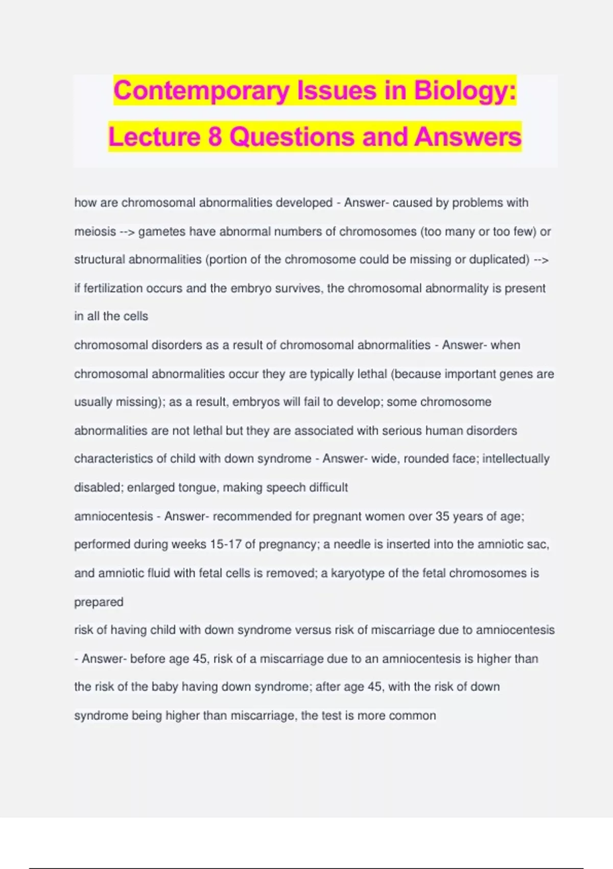Contemporary Issues in Biology: Lecture 8 Questions and Answers how are chromosomal abnormalities developed - Answer- caused by problems with meiosis --> gametes have abnormal numbers of chromosomes (too many or too few) or structural abnormalities (portion of the chromosome could be missing or duplicated) --> if fertilization occurs and the embryo survives, the chromosomal abnormality is present in all the cells chromosomal disorders as a result of chromosomal abnormalities - Answer- when chromosomal abnormalities occur they are typically lethal (because important genes are usually missing); as a result, embryos will fail to develop; some chromosome abnormalities are not lethal but they are associated with serious human disorders characteristics of child with down syndrome - Answer- wide, rounded face; intellectually disabled; enlarged tongue, making speech difficult amniocentesis - Answer- recommended for pregnant women over 35 years of age; performed during weeks 15-17 of pregnancy; a needle is inserted into the amniotic sac, and amniotic fluid with fetal cells is removed; a karyotype of the fetal chromosomes is prepared risk of having child with down syndrome versus risk of miscarriage due to amniocentesis - Answer- before age 45, risk of a miscarriage due to an amniocentesis is higher than the risk of the baby having down syndrome; after age 45, with the risk of down syndrome being higher than miscarriage, the test is more common example of a genetic disease caused by a single gene - Answer- cystic fibrosis: life- threatening disorder; damages lungs and also digestive system; mucous and other body fluids are thick and sticky; caused by a recessive allele important point about inheritance - Answer- genes have different forms, called alleles; each trait is controlled by effects of two alleles to two chromosomes; some alleles are dominant/recessive and other alleles are co-dominant a women with normal lung physiology has a child with a man who has normal lung physiology, but are both carriers of the allele. what is the chance that the child will have cystic fibrosis? - Answer- 25% hemophilia - Answer- caused by a sex-linked recessive allele where a person lacks the blood proteins for clotting; genetics and human diseases - Answer- about 4,000 human diseases are thought to be inherited; scientists are making progress figuring out where genes are located on chromosomes and in understanding how the mutations in genes cause disease; most diseases are likely controlled by the action of more than one gene; most diseases are effected by the environment as well as genes; the implication is that the presence of one allele does not indicate that you will develop a disease