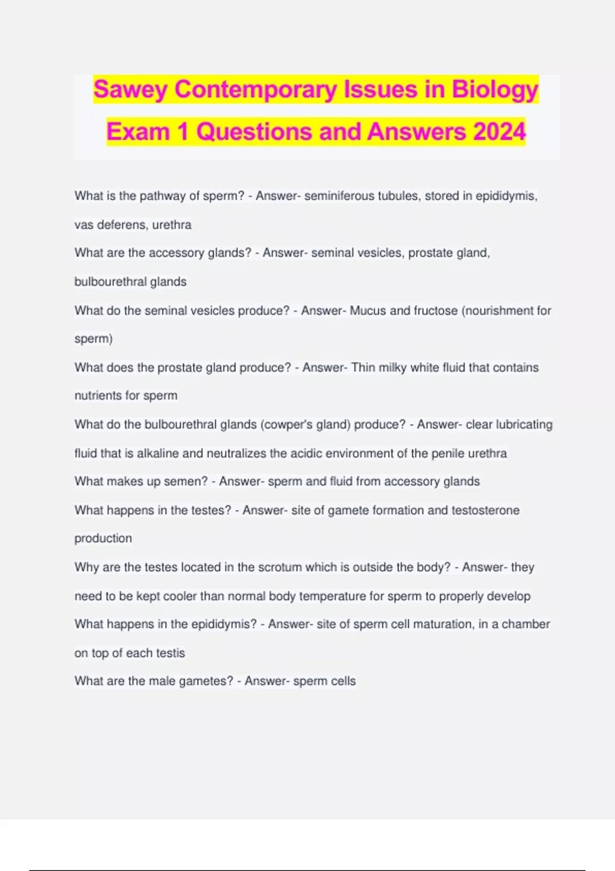 Sawey Contemporary Issues in Biology Exam 1 Questions and Answers 2024 What is the pathway of sperm? - Answer- seminiferous tubules, stored in epididymis, vas deferens, urethra What are the accessory glands? - Answer- seminal vesicles, prostate gland, bulbourethral glands What do the seminal vesicles produce? - Answer- Mucus and fructose (nourishment for sperm) What does the prostate gland produce? - Answer- Thin milky white fluid that contains nutrients for sperm What do the bulbourethral glands (cowper's gland) produce? - Answer- clear lubricating fluid that is alkaline and neutralizes the acidic environment of the penile urethra What makes up semen? - Answer- sperm and fluid from accessory glands What happens in the testes? - Answer- site of gamete formation and testosterone production Why are the testes located in the scrotum which is outside the body? - Answer- they need to be kept cooler than normal body temperature for sperm to properly develop What happens in the epididymis? - Answer- site of sperm cell maturation, in a chamber on top of each testis What are the male gametes? - Answer- sperm cells How does male puberty begin? - Answer- hypothalamus sends releasing hormones to the pituitary gland which causes it to begin producing FSH and LH Where do FSH and LH travel to? - Answer- they travel from the pituitary gland through the bloodstream to the testes What does FSH and LH do to the testes? - Answer- causes the cells of the seminiferous tubules to being undergoing meiosis and produce male gametes and testosterone How do male hormones fluctuate throughout life? - Answer- they spike and then slowly decline until death Where is the prostate gland located? - Answer- below the bladder, the urethra passes through it What is the problem with an enlarged prostate? - Answer- constricts urethra, dilates bladder, dilates ureters, causes discomfort or kidney damage What are the normal sizes of prostates? - Answer- for men under 50 it is the size of a walnut, but after 50 it can enlarge to the size of a lemon or peach What is a transurethral resection of the prostate? - Answer- a rectoscope is stuck up a mans urethra and an electrical loop is extended which removes excessive tissue and opens urethra Is prostate cancer common? - Answer- second most common form of cancer in men and the second most common cause of cancer death How can prostate cancer kill you? - Answer- if the cancer cells leave the prostate and spread to other parts of the body (metastasizes) What are the risk factors for prostate cancer? - Answer- age, family history, African American men, farmer