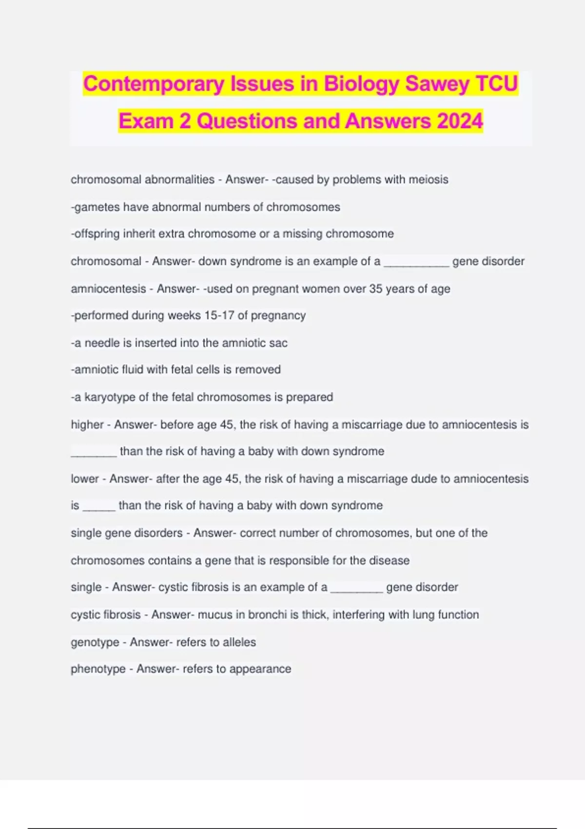 Contemporary Issues in Biology Sawey TCU Exam 2 Questions and Answers 2024 chromosomal abnormalities - Answer- -caused by problems with meiosis -gametes have abnormal numbers of chromosomes -offspring inherit extra chromosome or a missing chromosome chromosomal - Answer- down syndrome is an example of a __________ gene disorder amniocentesis - Answer- -used on pregnant women over 35 years of age -performed during weeks 15-17 of pregnancy -a needle is inserted into the amniotic sac -amniotic fluid with fetal cells is removed -a karyotype of the fetal chromosomes is prepared higher - Answer- before age 45, the risk of having a miscarriage due to amniocentesis is _______ than the risk of having a baby with down syndrome lower - Answer- after the age 45, the risk of having a miscarriage dude to amniocentesis is _____ than the risk of having a baby with down syndrome single gene disorders - Answer- correct number of chromosomes, but one of the chromosomes contains a gene that is responsible for the disease single - Answer- cystic fibrosis is an example of a ________ gene disorder cystic fibrosis - Answer- mucus in bronchi is thick, interfering with lung function genotype - Answer- refers to alleles phenotype - Answer- refers to appearance down syndrome - Answer- occurs when 21st chromosome pairs don't separate properly during meiosis-child gets 3 chromosomes of 21st pair single - Answer- hemophilia is an example of a _____ gene disorder hemophilia - Answer- -person lacks the blood proteins for clotting -caused by a sex-linked recessive allele no - Answer- can a male be a carrier of a sex linked disease? 4000 - Answer- about how many human diseases are thought to be inherited? 2000 - Answer- doctors now have genetic tests for over _______ conditions in vitro fertilization - Answer- tests can be run on embryos this way prior to implantation 2 million - Answer- humans are made of about ________ types of proteins mitochondria - Answer- where does cellular respiration take place? ATP glucose fats - Answer- humans run on energy of _____ converted from ______ and _______