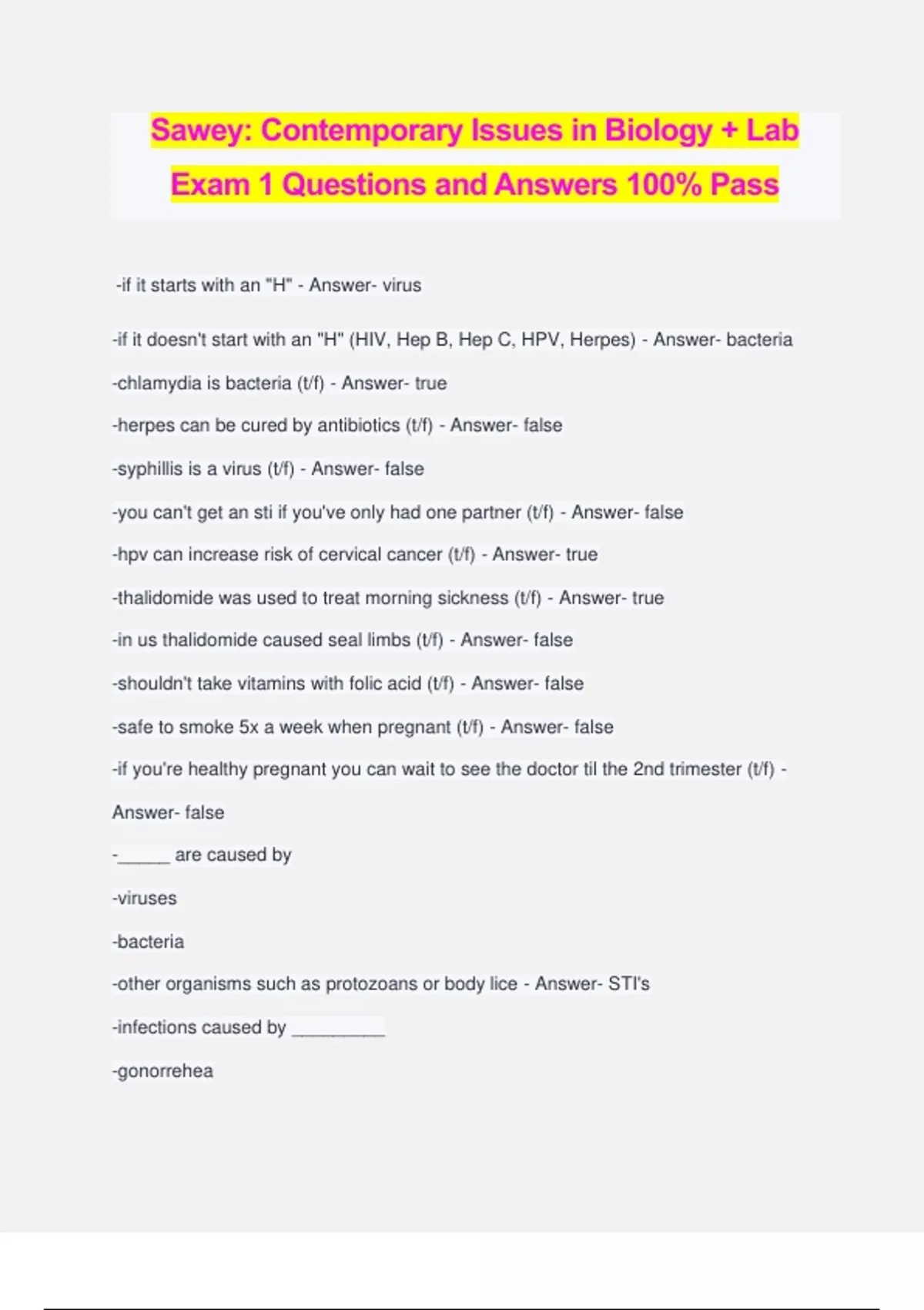 Sawey: Contemporary Issues in Biology + Lab Exam 1 Questions and Answers 100% Pass -if it starts with an "H" - Answer- virus -if it doesn't start with an "H" (HIV, Hep B, Hep C, HPV, Herpes) - Answer- bacteria -chlamydia is bacteria (t/f) - Answer- true -herpes can be cured by antibiotics (t/f) - Answer- false -syphillis is a virus (t/f) - Answer- false -you can't get an sti if you've only had one partner (t/f) - Answer- false -hpv can increase risk of cervical cancer (t/f) - Answer- true -thalidomide was used to treat morning sickness (t/f) - Answer- true -in us thalidomide caused seal limbs (t/f) - Answer- false -shouldn't take vitamins with folic acid (t/f) - Answer- false -safe to smoke 5x a week when pregnant (t/f) - Answer- false -if you're healthy pregnant you can wait to see the doctor til the 2nd trimester (t/f) - Answer- false -_____ are caused by -viruses -bacteria -other organisms such as protozoans or body lice - Answer- STI's -infections caused by _________ -gonorrehea -syphilis -chlamydia - Answer- bacteria -how to treat a virus - Answer- treat symptoms only -how to treat bacteria - Answer- antibiotics -two parts of breast milk - Answer- foremilk, hindmilk -radiation -infection/virus -metabolic conditions -drugs and chemicals - Answer- teratogens -babies receive _________ directly from the mother both during pregnancy and while breastfeeding - Answer- antibodies -effects of one teratogen" thalidomide - Answer- seal like limbs -never allowed in the US -teratogen -used to treat morning sickness and nauseau -resulted in seal like limbs - Answer- thalidomide -father of biology - Answer- aristotle -observation -> hypotheses -> tests of hypotheses -> results - Answer- scientific method -given placebo -the variable being tested is absent -compile results - Answer- control group -given drug -the variable being tested is present -compile results - Answer- experimental group -scientists in the field give anonymous reviews, accepting or rejecting the paper for publication -the reviewers cannot have any personal or professional relationship with the authors - Answer- peer review and publishing process -results become a part of the general knowledge only after they are published in this - Answer- scientific journal -a system of ideas or misconceptions erroneously regarded as science - Answer- pseudoscience -why is the us government still spending billions of dollars funding scientific research? - Answer- -why can nonscientists have confidence in the information published in the reputable (time magazine, new york times, smithsonian)? - Answer- -if you had to design a study to investigate the effects of a new drug on human health, what type of design would you use and how does it work? - Answer- -site of gamete formation (sperm or spermatozoa) and testosterone production -contains many coiled tubes called seminferous tubules
