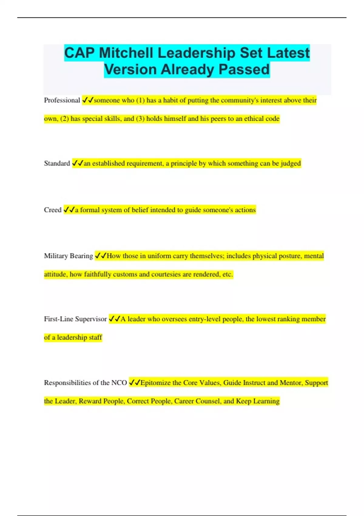 CAP Mitchell Leadership Set Latest Version Already Passed Professional someone who (1) has a habit of putting the community's interest above their own, (2) has special skills, and (3) holds himself and his peers to an ethical code Standard an established requirement, a principle by which something can be judged Creed a formal system of belief intended to guide someone's actions Military Bearing How those in uniform carry themselves; includes physical posture, mental attitude, how faithfully customs and courtesies are rendered, etc. First-Line Supervisor A leader who oversees entry-level people, the lowest ranking member of a leadership staff Responsibilities of the NCO Epitomize the Core Values, Guide Instruct and Mentor, Support the Leader, Reward People, Correct People, Career Counsel, and Keep Learning Technically Ready, Physically Ready, and Mentally Ready Air Forces Three Requirements for NCO Readiness Servant Leadership the form of leadership wear the leader sees himself or herself primarily as the servant of the team Coaching is the process through which leaders try to solve performance problems and develop their people the goal of coaching To help the coachee reach a higher level of success Open-Ended Question a question that requires more than a "yes" or "no" Supervise means to observe and direct people in the fulfillment of the mission Punishment a negative consequence Constructive Discipline a learning process that provides an opportunity for positive growth Motivation is the reason for action and is that which gives purpose and direction to a behavior; it is your "why" Intrinsic Rewards are motivators at work within you Extrinsic Rewards are motivators at work outside of you Strategic, Operational, Tactical Arenas The three leadership arenas Command Intent is the leader's concise expression of purpose Desired-End State What a leader hopes to achieve; what the world will look like when the goal has been ment Initiative is the ability to make sound judgments and act independently Dissent To express an opinion that differs from the official view The Seven Needs of a Team Common goals, Leadership, Involvement from All, Good Morale, Open Communication, Mutual Respect, and Ways to resolve Conflict Critical Thinking is a self-guided, self-disciplined thinking which attempts to reason at a highest level of quality in a fair-minded way; is a habit of