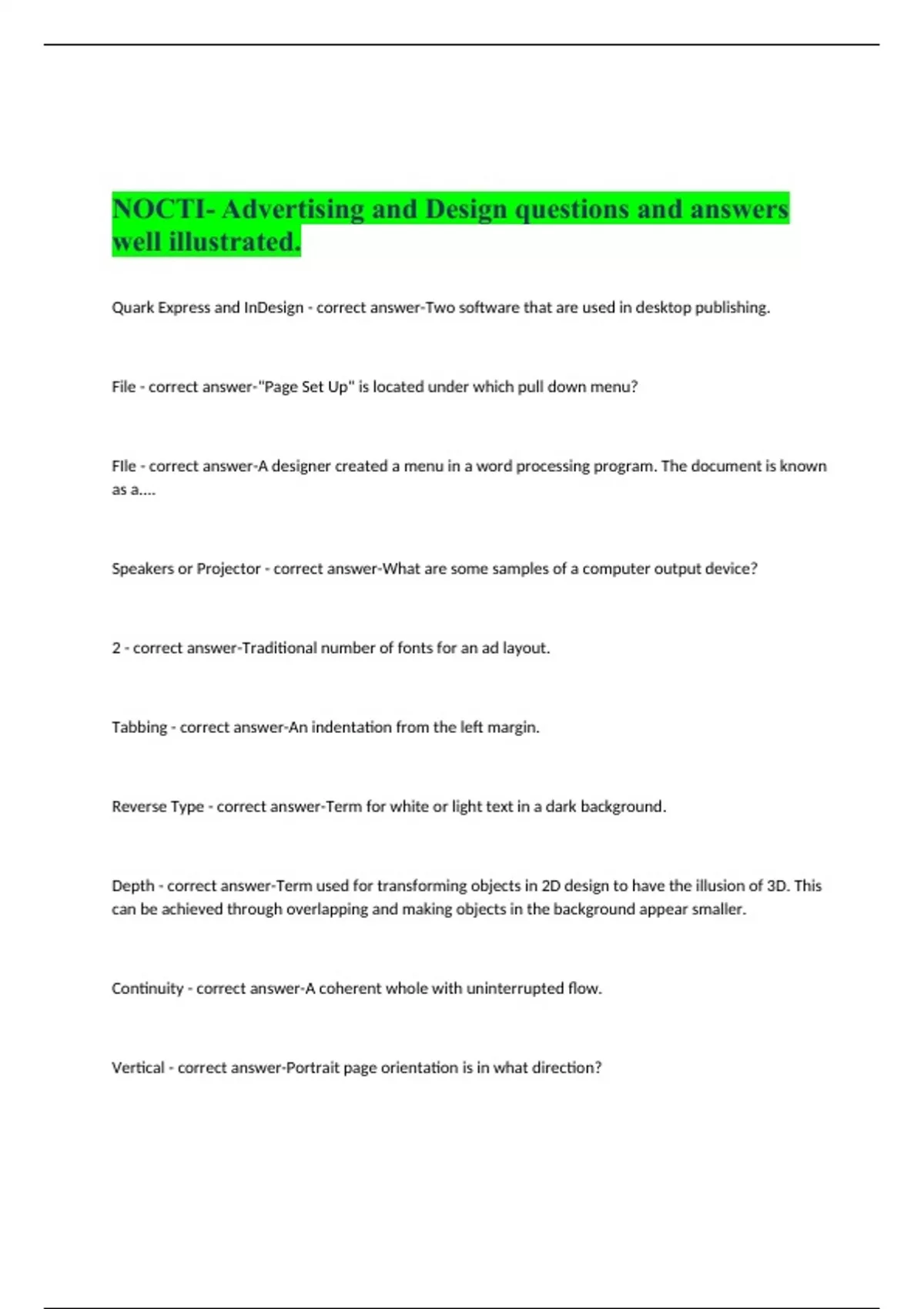 Quark Express and InDesign - correct answer-Two software that are used in desktop publishing. File - correct answer-"Page Set Up" is located under which pull down menu? FIle - correct answer-A designer created a menu in a word processing program. The document is known as a.... Speakers or Projector - correct answer-What are some samples of a computer output device? 2 - correct answer-Traditional number of fonts for an ad layout. Tabbing - correct answer-An indentation from the left margin. Reverse Type - correct answer-Term for white or light text in a dark background. Depth - correct answer-Term used for transforming objects in 2D design to have the illusion of 3D. This can be achieved through overlapping and making objects in the background appear smaller. Continuity - correct answer-A coherent whole with uninterrupted flow.