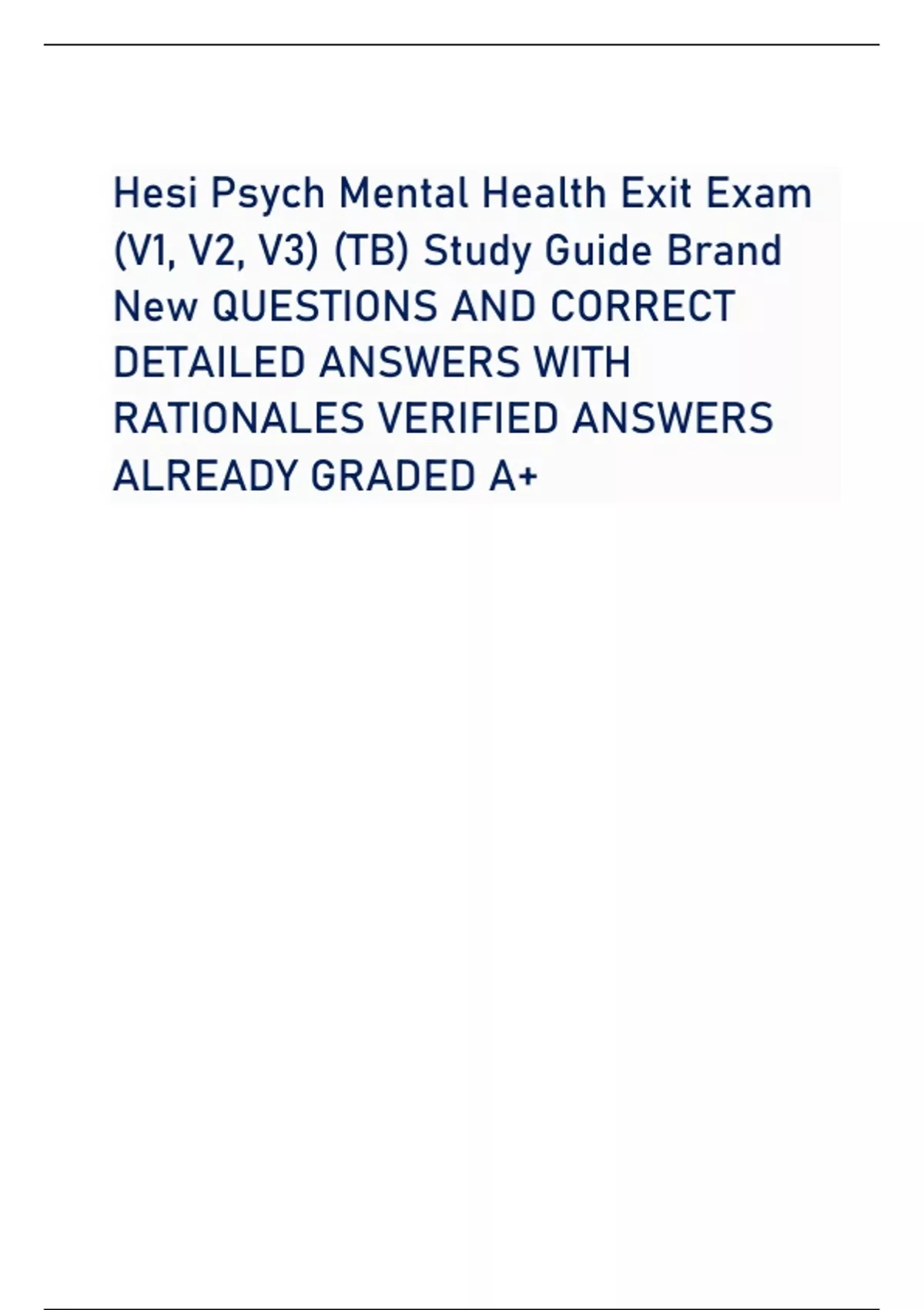 Hesi Psych Mental Health Exit Exam (V1, V2, V3) (TB) Study Guide Brand New QUESTIONS AND CORRECT DETAILED ANSWERS WITH RATIONALES VERIFIED ANSWERS ALREADY GRADED A+