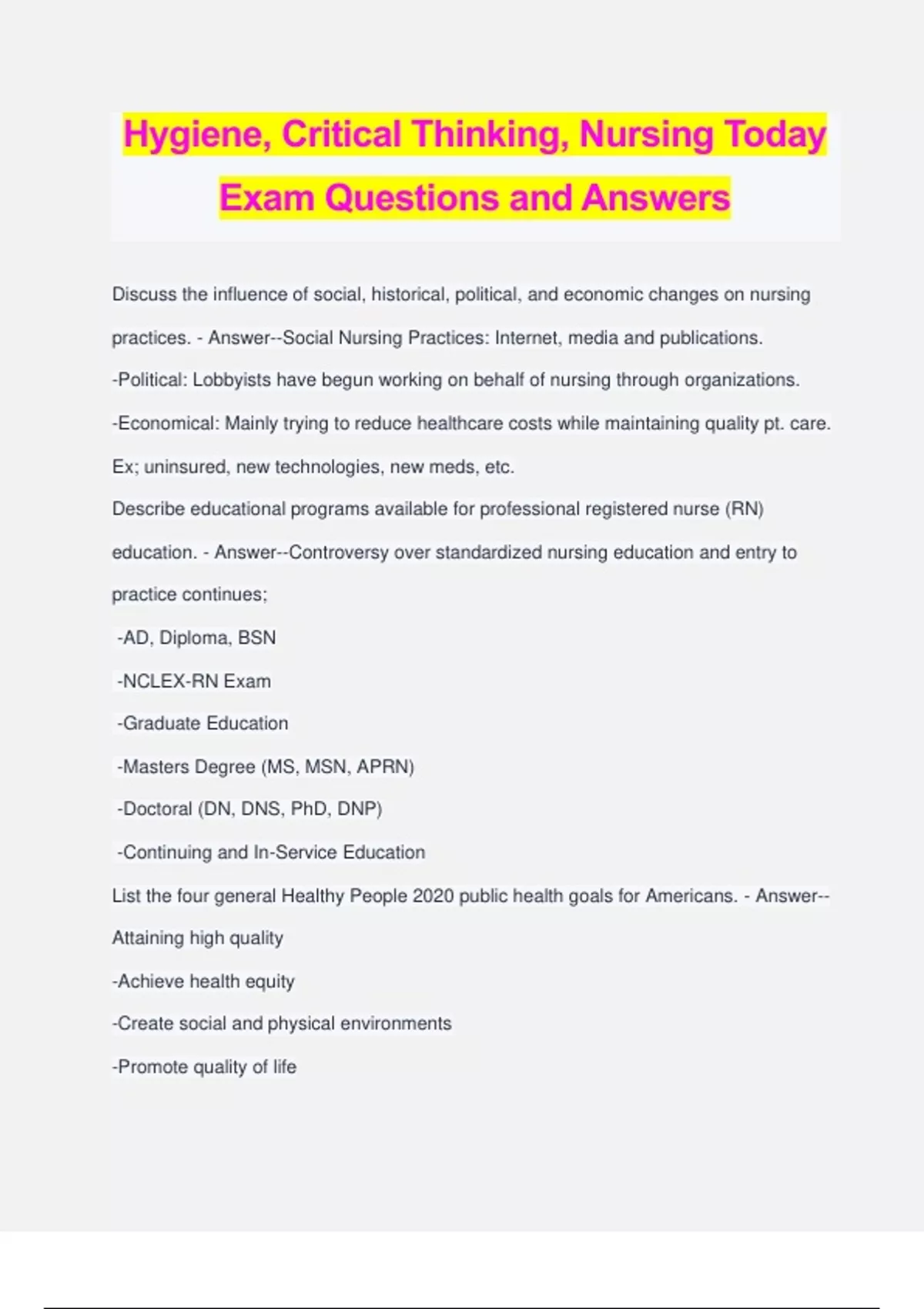 Hygiene, Critical Thinking, Nursing Today Exam Questions and Answers Discuss the influence of social, historical, political, and economic changes on nursing practices. - Answer--Social Nursing Practices: Internet, media and publications. -Political: Lobbyists have begun working on behalf of nursing through organizations. -Economical: Mainly trying to reduce healthcare costs while maintaining quality pt. care. Ex; uninsured, new technologies, new meds, etc. Describe educational programs available for professional registered nurse (RN) education. - Answer--Controversy over standardized nursing education and entry to practice continues; -AD, Diploma, BSN -NCLEX-RN Exam -Graduate Education -Masters Degree (MS, MSN, APRN) -Doctoral (DN, DNS, PhD, DNP) -Continuing and In-Service Education List the four general Healthy People 2020 public health goals for Americans. - Answer-- Attaining high quality -Achieve health equity -Create social and physical environments -Promote quality of life Discuss the definition of "Health" - Answer--State of complete physical, mental, and social well being, not mereley the absence of disease or infirmity. Describe variables influencing health beliefs and practices. - Answer--Internal Variables -Developmental: -Kid vs. Adult -Intellectual Background vs. Health Knowlege -Perception of Function vs. Life Interferrence -Emotional vs. Fear; Anxiety -Spiritual vs. Religion -External Variables -Family Practices vs. What family believes -Psychosocial vs. Socioeconomic factors, depending on money and health beliefs -Cultural vs. What culture believes in Discuss three levels of preventive care. - Answer--Primary Prevention: it precedes disease or dysfunction, and is applied to pt.'s, considered physically and emotionally healthy. -Secondary Prevention: to focus on individuals who are experiencing health problems or illnesses and are at risk for developing complications or worsening conditions. -Tertiary Prevention: occurs when a defect or disability is permanent and irreversible. Discuss risk factor modification and changing health behaviors. - Answer--Discuss health hazards with pt.'s following nurse assessment, helping pt. decide if he or she wants to improve.