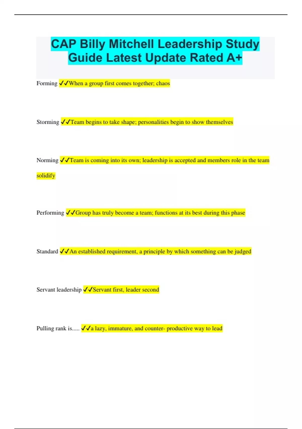 CAP Billy Mitchell Leadership Study Guide Latest Update Rated A+ Forming When a group first comes together; chaos Storming Team begins to take shape; personalities begin to show themselves Norming Team is coming into its own; leadership is accepted and members role in the team solidify Performing Group has truly become a team; functions at its best during this phase Standard An established requirement, a principle by which something can be judged Servant leadership Servant first, leader second Pulling rank is..... a lazy, immature, and counter- productive way to lead Professional Someone who has special skills, puts the community's interest above their own, and holds themselves and their peers to an ethical code Hawthorne studies when leaders pay attention to their people and treat them as partners, people feel appreciated and will perform better In the fairy tale understanding of leader- ship offered by the great man theory, our civilization would be great again if only A superhero appeared to guide us In concluding an informative speech, a good technique is to communicate to the audience _______ Something you want them to believe or to do When you believe that a person is acting in good faith, you show this core value: Respect A unit's performance on the drill field is a measure of the cadets' sense of Self-discipline People can show respect to the American flag bu Burning the flag if worn out Strong charisma surrounds the leader with followers who NOT the LOYAL answer choice Coaching begins with Observation The practice of stepping back from an issue so as to take more of it in is called Big-picture thinking Every speech should have a specific______, an exact statement of what you want your audience to understand, do, or believe Purpose Why is leadership a science? Because it requires Careful study Servant leadership is the new leaders vaccine against becoming A self-centered bully A leader who focuses almost exclusively on how tasks will be accomplished represents the Path- Goal leadership behavior called