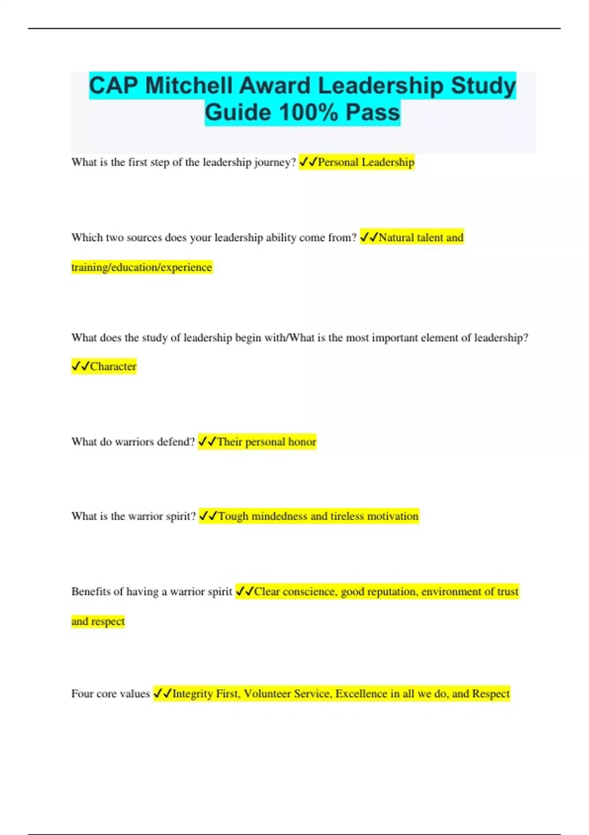 CAP Mitchell Award Leadership Study Guide 100% Pass What is the first step of the leadership journey? Personal Leadership Which two sources does your leadership ability come from? Natural talent and training/education/experience What does the study of leadership begin with/What is the most important element of leadership? Character What do warriors defend? Their personal honor What is the warrior spirit? Tough mindedness and tireless motivation Benefits of having a warrior spirit Clear conscience, good reputation, environment of trust and respect Four core values Integrity First, Volunteer Service, Excellence in all we do, and Respect The willingness to do what is right, even when no one is looking Integrity Selflessness, the difference between giving and taking Volunteer service Always give your best effort Excellence in all we do Treating others as they would like to be treated Respect Which Navy Admiral was a Vietnamese POW who never betrayed his country? James Stockdale Knowing how well you're living up to the core values/the ability to monitor and judge your own actions Self awareness the ability to direct your thoughts, emotions, and actions toward a meaningful purpose Self discipline The state of mind behind your actions Attitude Famous baseball player known as "iron horse," diagnosed with ALS, but still had a good attitude Lou Gehrig All attitudes, good or bad, are Contagious What is the first step to developing a positive attitude? Realizing attitude is a choice Solemn promise Oath What are military customs and courtesies rooted in? Politeness and respect What is the origin of the salute? Knights would salute with their sword hand, a sign of trust Who do cadets salute in uniform? Senior members, cadet officers