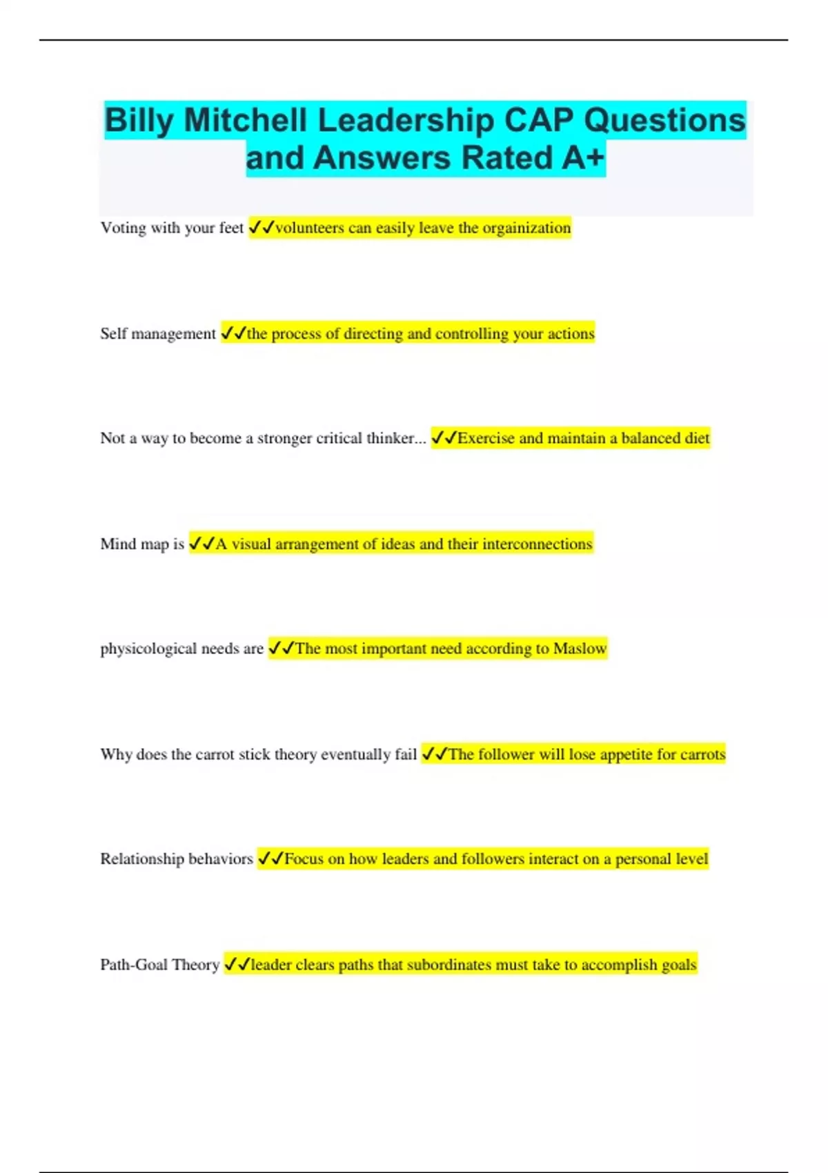 Billy Mitchell Leadership CAP Questions and Answers Rated A+
