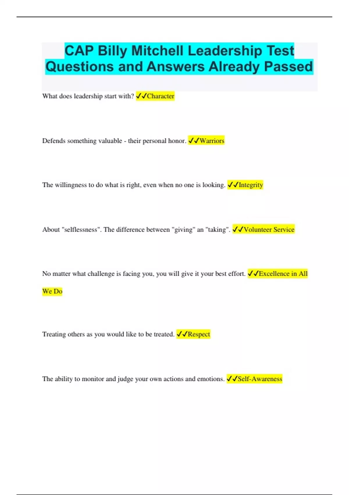 CAP Billy Mitchell Leadership Test Questions and Answers Already Passed