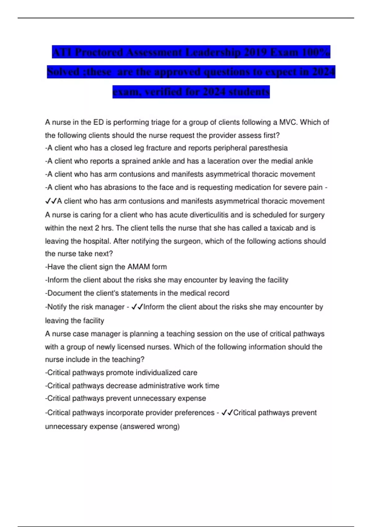 A nurse in the ED is performing triage for a group of clients following a MVC. Which of the following clients should the nurse request the provider assess first? -A client who has a closed leg fracture and reports peripheral paresthesia -A client who reports a sprained ankle and has a laceration over the medial ankle -A client who has arm contusions and manifests asymmetrical thoracic movement -A client who has abrasions to the face and is requesting medication for severe pain - A client who has arm contusions and manifests asymmetrical thoracic movement A nurse is caring for a client who has acute diverticulitis and is scheduled for surgery within the next 2 hrs. The client tells the nurse that she has called a taxicab and is leaving the hospital. After notifying the surgeon, which of the following actions should the nurse take next? -Have the client sign the AMAM form -Inform the client about the risks she may encounter by leaving the facility -Document the client's statements in the medical record -Notify the risk manager - Inform the client about the risks she may encounter by leaving the facility A nurse case manager is planning a teaching session on the use of critical pathways with a group of newly licensed nurses. Which of the following information should the nurse include in the teaching? -Critical pathways promote individualized care -Critical pathways decrease administrative work time -Critical pathways prevent unnecessary expense -Critical pathways incorporate provider preferences - Critical pathways prevent unnecessary expense (answered wrong) A nurse is caring for a client who has an informed consent form for an upcoming procedure in his health record. Which of the following actions should the nurse take to validate that the client understands the procedure? -Review documentation by the provider of discussing the procedure with the client -Verify that the client's signature is on the informed consent form -Ask the client to verbalize the purpose, risks, and benefits of the procedure -Document the client's completed pre-procedure checklist in the medical record - Ask the client to verbalize the purpose, risks, and benefits of the procedure A nurse at an urgent care clinic notices that a pain assessment is not being performed for all clients as required by policy. Which of the following actions should the nurse take to ensure care is provided according to policy? -Check client satisfaction surveys for feedback on this issue -Post an article on pain assessment on the bulletin board -Document this finding on an incident report -Report this issue to the nurse manager - Report this issue to the nurse manager A client is being discharged with a post-op infection, requiring daily home IV antibiotics through a PICC line. Which of the following actions should the case manager perform prior to discharge? -Assess the client's home environment for possible reservoirs of infection -Verify the patency of the PICC line -Provide dressing change and wound assessment teaching -Ensure home infusion therapy has been arranged - Ensure that home infusion therapy has been arranged (answered wrong) A nurse manager is completing a performance improvement audit and determines documentation of client discharge teaching is below the expected benchmark. Which of the following actions should the nurse implement first? -Offer incentives for the staff once the unit's benchmark is above average -Train specific nurses to use a standard discharge teaching plan -Determine the factors that interfere with the documentation of client education -Include client discharge teaching as part of the annual performance evaluation - Determine the factors that interfere with the documentation of client education A charge nurse is orienting a newly licensed nurse to the facility's policies regarding EMRs. Which of the following statements by the newly licensed nurse indicates an understanding of the instructions? -I will make sure the monitor is turned off when I have to leave the computer terminal -I can share my password with nursing students assigned to my unit -I will allow a client to make changes directly to their medical record -After I finish with the printout of my assignment. I'll put it in the shredder - After I finish with the printout of my assignment, I'll put it in the shredder