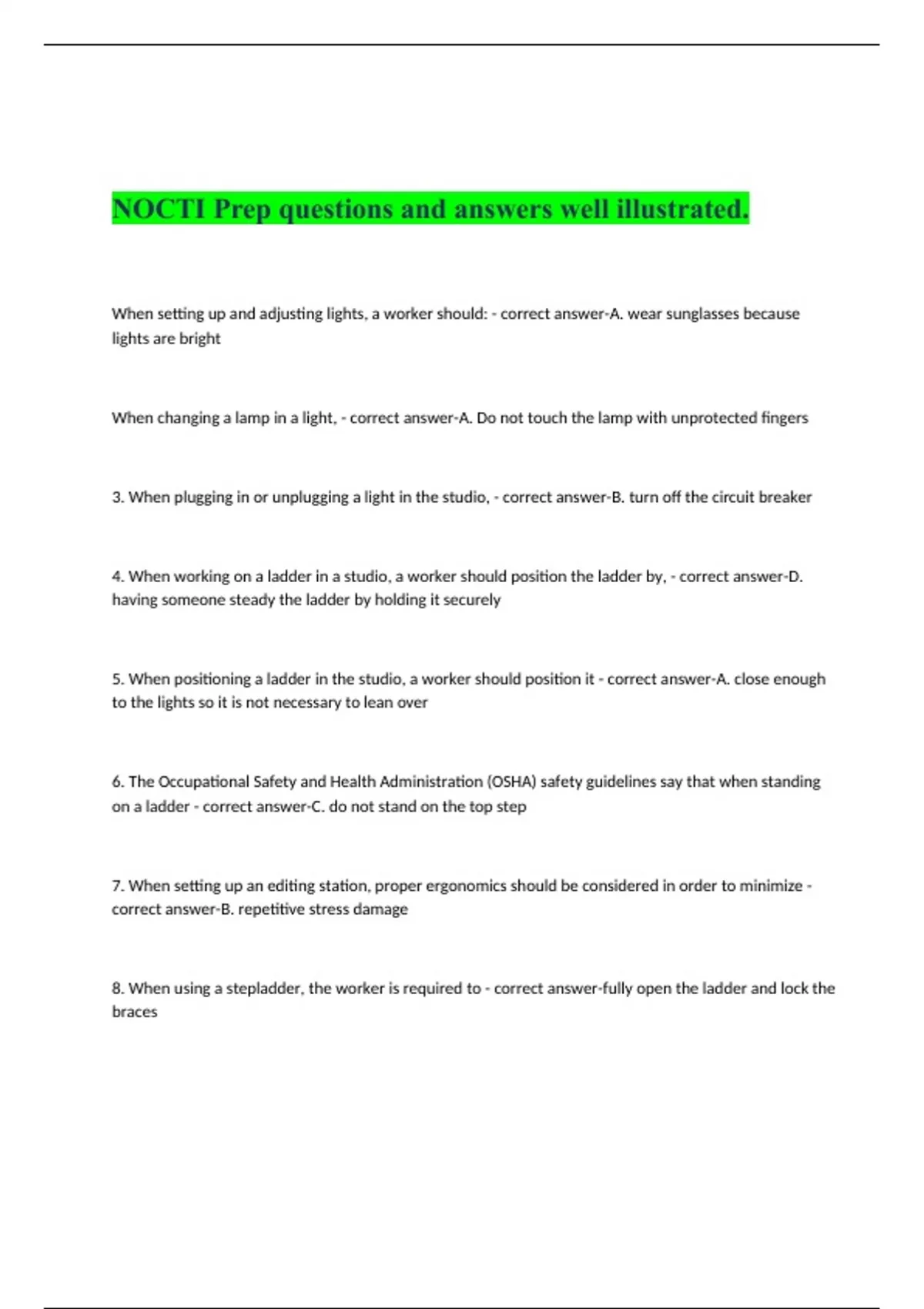 When setting up and adjusting lights, a worker should: - correct answer-A. wear sunglasses because lights are bright When changing a lamp in a light, - correct answer-A. Do not touch the lamp with unprotected fingers 3. When plugging in or unplugging a light in the studio, - correct answer-B. turn off the circuit breaker 4. When working on a ladder in a studio, a worker should position the ladder by, - correct answer-D. having someone steady the ladder by holding it securely 5. When positioning a ladder in the studio, a worker should position it - correct answer-A. close enough to the lights so it is not necessary to lean over 6. The Occupational Safety and Health Administration (OSHA) safety guidelines say that when standing on a ladder - correct answer-C. do not stand on the top step 7. When setting up an editing station, proper ergonomics should be considered in order to minimize - correct answer-B. repetitive stress damage 8. When using a stepladder, the worker is required to - correct answer-fully open the ladder and lock the braces