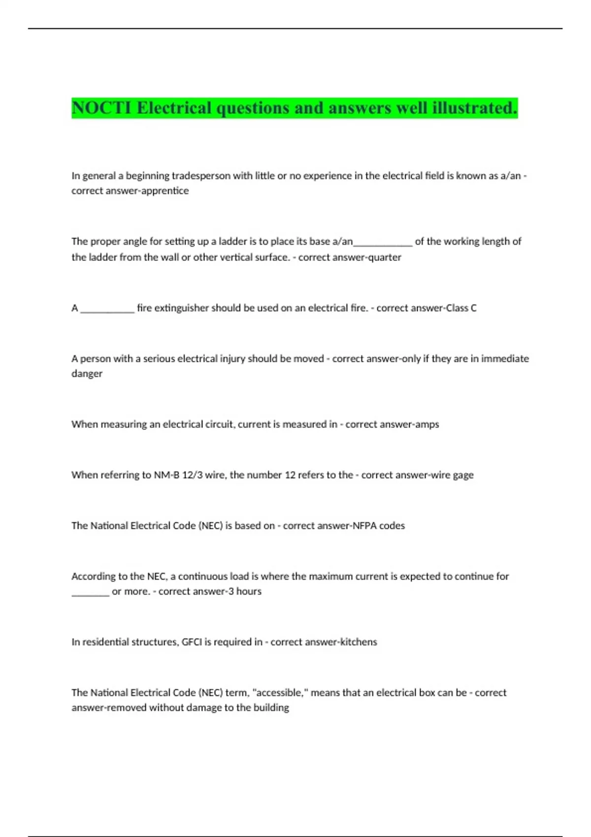 In general a beginning tradesperson with little or no experience in the electrical field is known as a/an - correct answer-apprentice The proper angle for setting up a ladder is to place its base a/an___________ of the working length of the ladder from the wall or other vertical surface. - correct answer-quarter A __________ fire extinguisher should be used on an electrical fire. - correct answer-Class C A person with a serious electrical injury should be moved - correct answer-only if they are in immediate danger When measuring an electrical circuit, current is measured in - correct answer-amps When referring to NM-B 12/3 wire, the number 12 refers to the - correct answer-wire gage The National Electrical Code (NEC) is based on - correct answer-NFPA codes According to the NEC, a continuous load is where the maximum current is expected to continue for _______ or more. - correct answer-3 hours In residential structures, GFCI is required in - correct answer-kitchens The National Electrical Code (NEC) term, "accessible," means that an electrical box can be - correct answer-removed without damage to the building