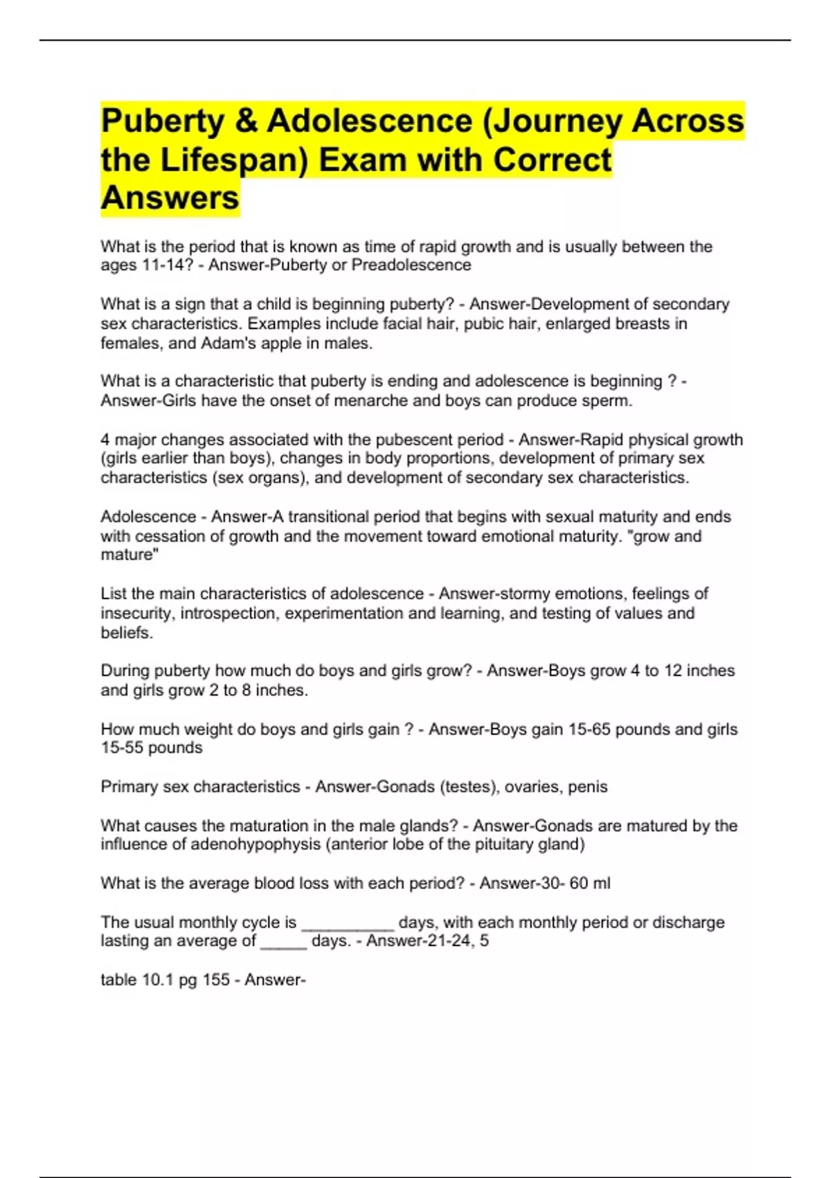Puberty & Adolescence (Journey Across the Lifespan) Exam with Correct Answers