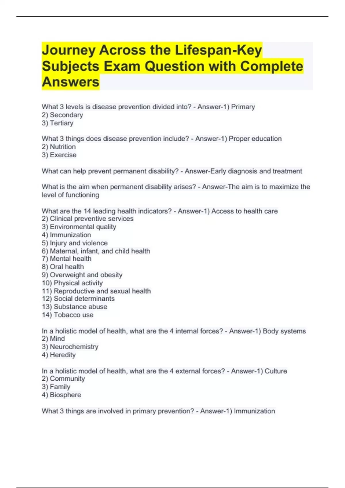 Journey Across the Lifespan-Key Subjects Exam Question with Complete Answers What 3 things are involved in secondary prevention? - Answer-1) Screening 2) Treatment 3) Disease control What 3 things are involved in tertiary prevention? - Answer-1) Rehabilitation 2) Physical therapy, diet, exercise, stress reduction 3) Pain control What are 6 health-promoting behaviors? - Answer-1) Sound nutritional practice 2) Chemical avoidance 3) Regular physical science 4) Stress management 5) Disease prevention 6) Healthy self-concept What are the 9 social factors that influence diet? - Answer-1) Attitude 2) Economic and price structuring 3) Food and agricultural policy 4) Food assistance programs 5) Knowledge 6) Skills 7) Social support 8) Societal and cultural factors 9) Tobacco or drug usage What are the 6 types of nutrients? - Answer-1) Proteins 2) Carbohydrates 3) Fats 4) Vitamins 5) Minerals 6) Water What are proteins broken down into in the body? - Answer-Amino acids