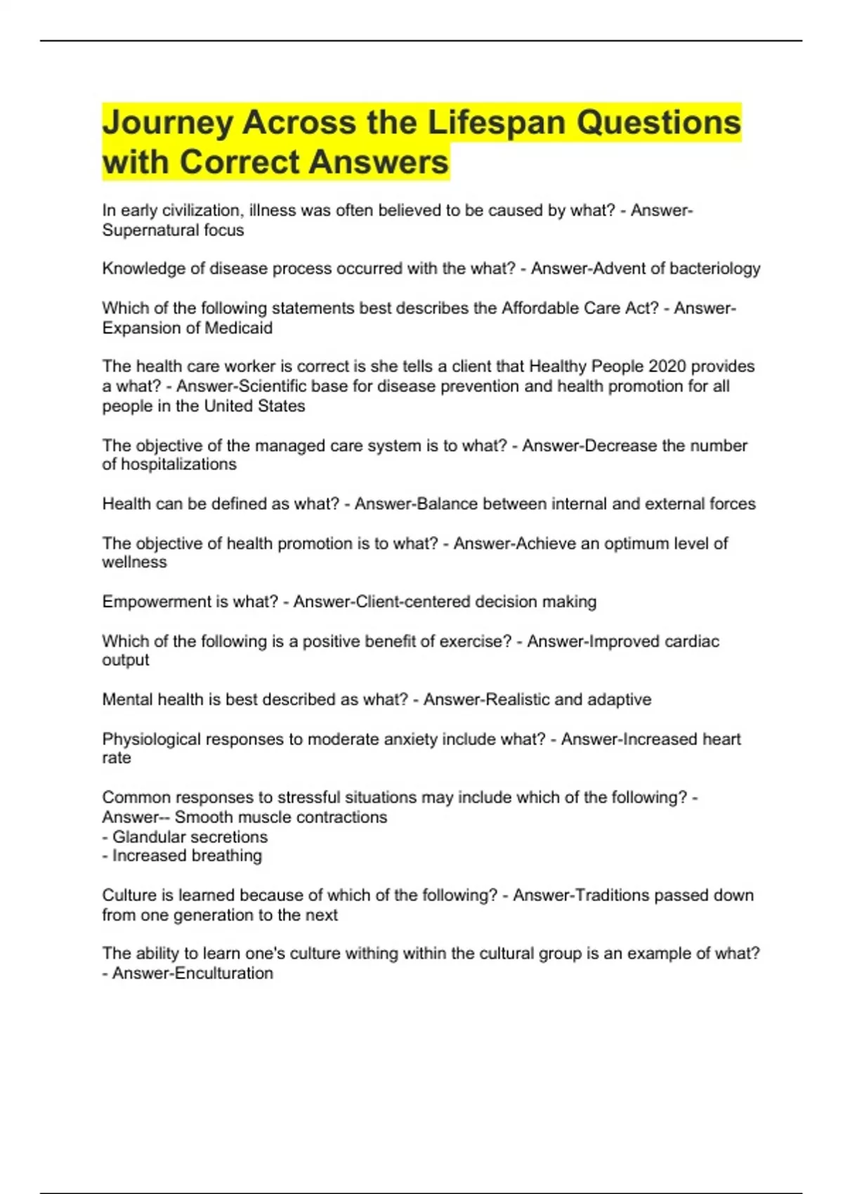 Journey Across the Lifespan Questions with Correct Answers Empowerment is what? - Answer-Client-centered decision making Which of the following is a positive benefit of exercise? - Answer-Improved cardiac output Mental health is best described as what? - Answer-Realistic and adaptive Physiological responses to moderate anxiety include what? - Answer-Increased heart rate Common responses to stressful situations may include which of the following? - Answer-- Smooth muscle contractions - Glandular secretions - Increased breathing Culture is learned because of which of the following? - Answer-Traditions passed down from one generation to the next