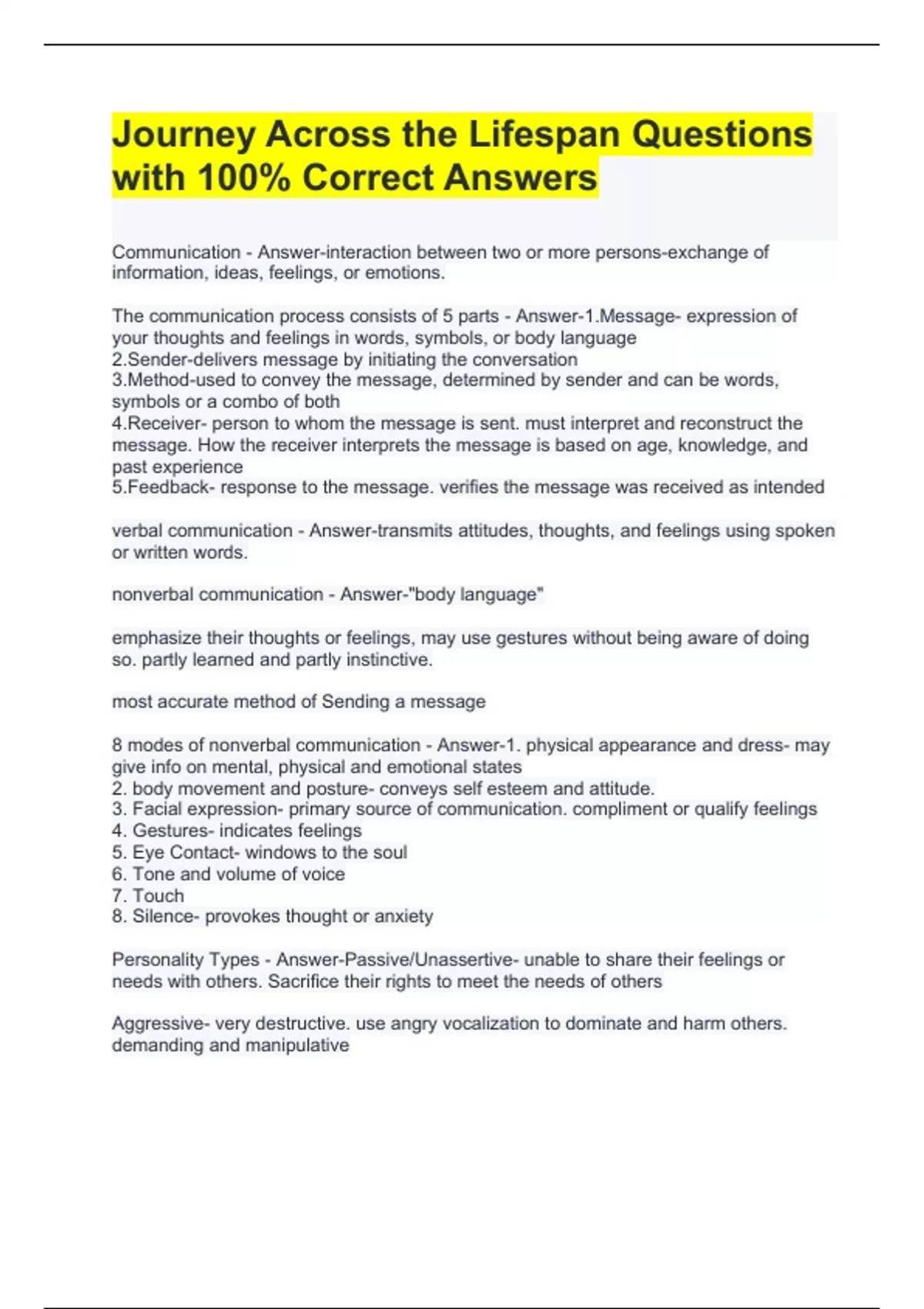 Journey Across the Lifespan Questions with 100% Correct Answers Two Styles of Communication - Answer-Social communication- used in everyday life between family, friends, coworkers. light and superficial. Therapeutic Communication is purposeful and goal oriented. Health care pro's use this in work interactions, between physician and patient, nurse and patient, nurse and family of patient 6 components of therapeutic communication: - Answer-1. Listening and observing- messages are sent in cognitive or affective domains, or both. Cognitive is the message expressed in words Affective are the feelings expressed in tone of words. 2. Warmth- cordiality/acceptance, person feels relaxed and secure 3. Genuineness-being yourself, open and truthful 4. Attentiveness-concentrating on what the other person is saying to demonstrate the patient has your full attention 5. Empathy-shows you understand a person's feelings and view the world as they do. allows you to stay in control versus sympathy 6. Positive regard- accepting the patient exactly as they are. requires you to be nonjudgmental. Respect/value the patient Listening - Answer-active or passive and involves the interpretation of the spoken word. 3 Phases of Therapeutic Communication Orientation Phase - Answer-Both nurse an patient show anxiety, reduce this by introducing yourself and giving your title, broad opening statement to set the tone and allow for an exchange of words. learn concerns/needs. GOAL is build trust 3 Phases of Therapeutic Communication Working Phase - Answer-nurse determines type of coping mechanisms that the client is using and what support systems exist to help develop plan of care and realistic goals to promote independence and optimal functioning. Assure privacy for the client, GOAL client shares/explores thoughts and feelings and work toward a change in behavior or possible solution 3 Phases of Therapeutic Communication