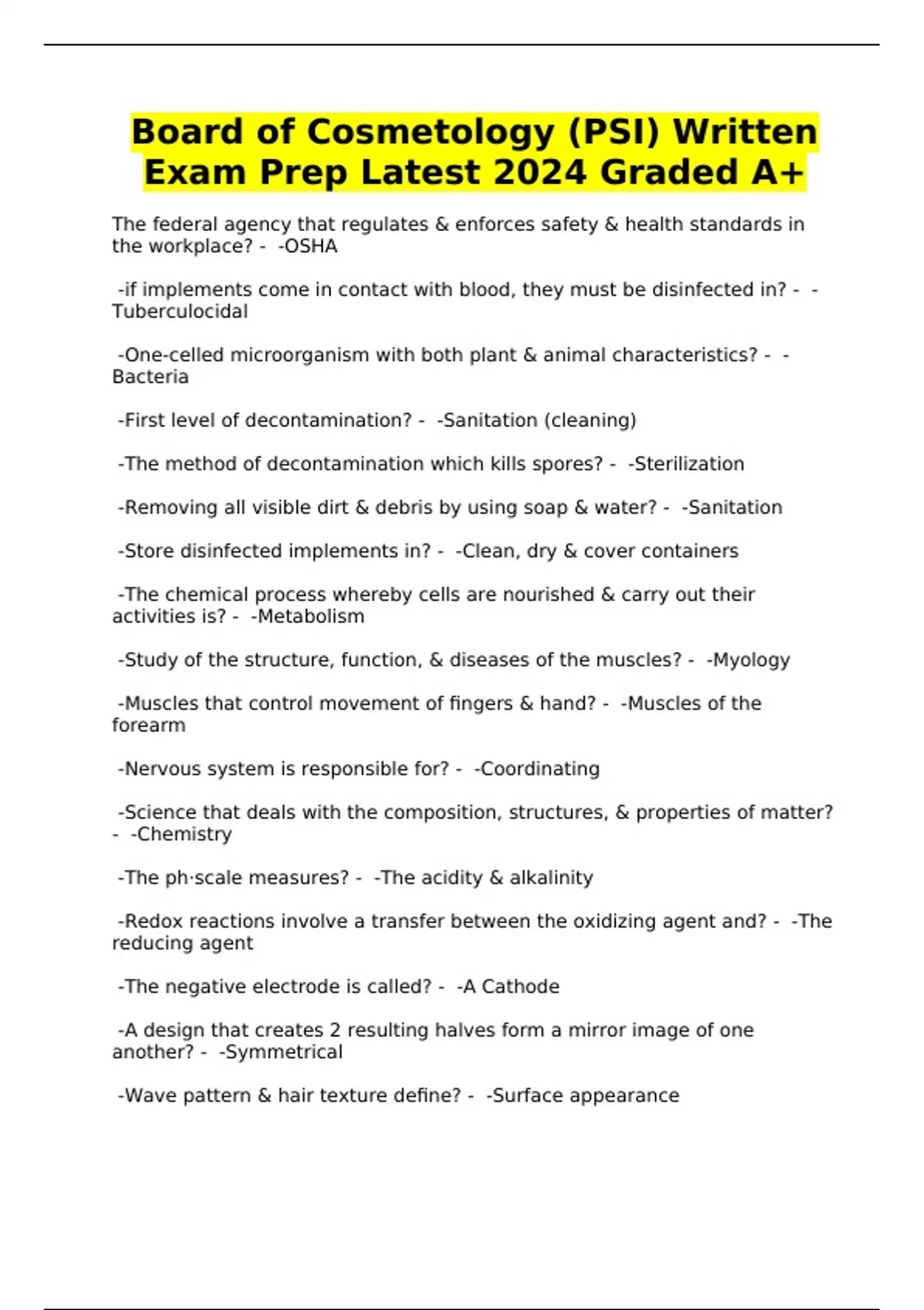 Board of Cosmetology (PSI) Written Exam Prep Latest 2024 Graded A+