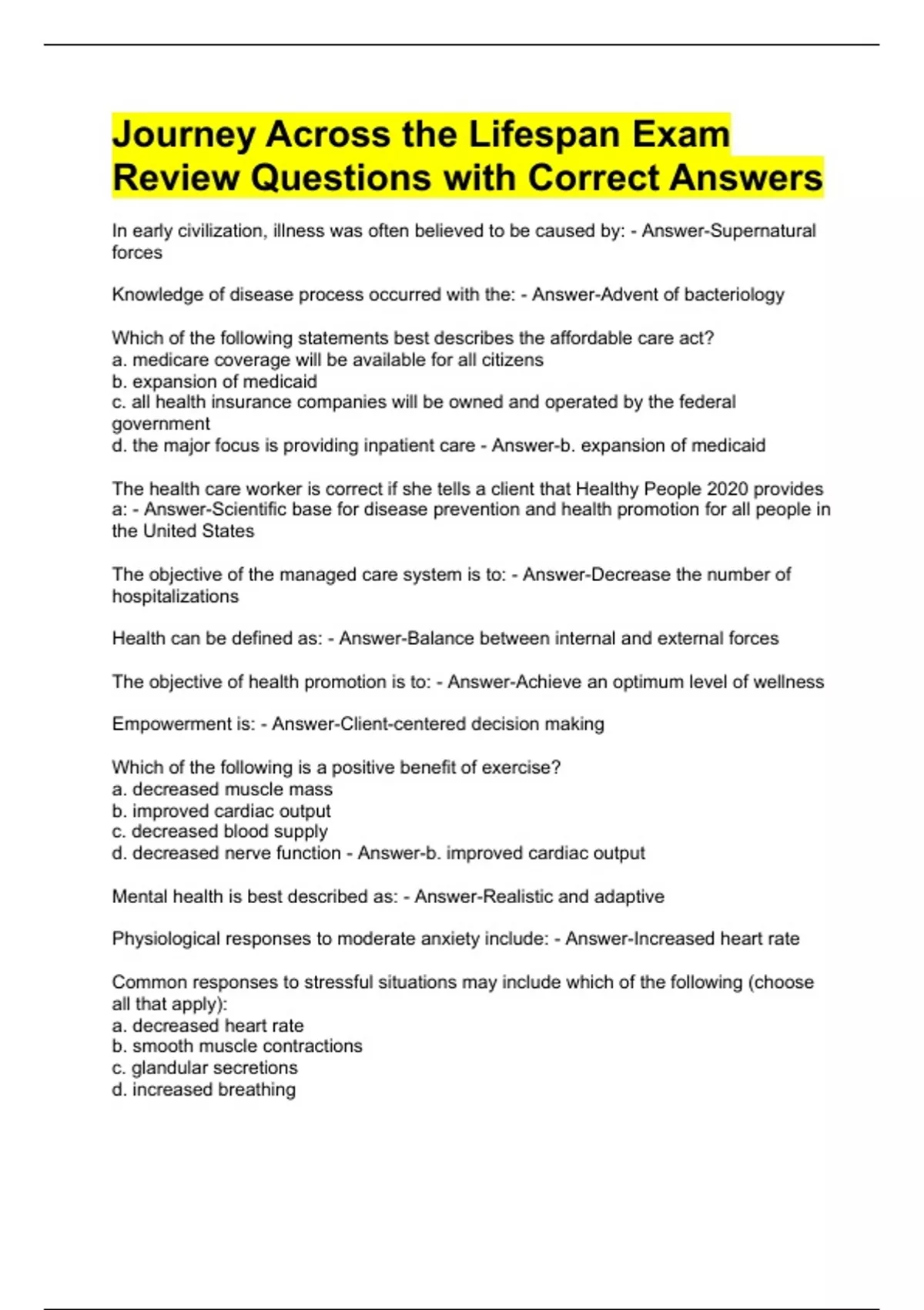 Journey Across the Lifespan Exam Review Questions with Correct Answers Empowerment is: - Answer-Client-centered decision making Which of the following is a positive benefit of exercise? a. decreased muscle mass b. improved cardiac output c. decreased blood supply d. decreased nerve function - Answer-b. improved cardiac output Mental health is best described as: - Answer-Realistic and adaptive Physiological responses to moderate anxiety include: - Answer-Increased heart rate Common responses to stressful situations may include which of the following (choose all that apply): a. decreased heart rate b. smooth muscle contractions c. glandular secretions d. increased breathing e. drowsiness - Answer-b. smooth muscle contractions c. glandular secretions d. increased breathing Culture is learned because of: - Answer-Traditions passed down from one generation to the next