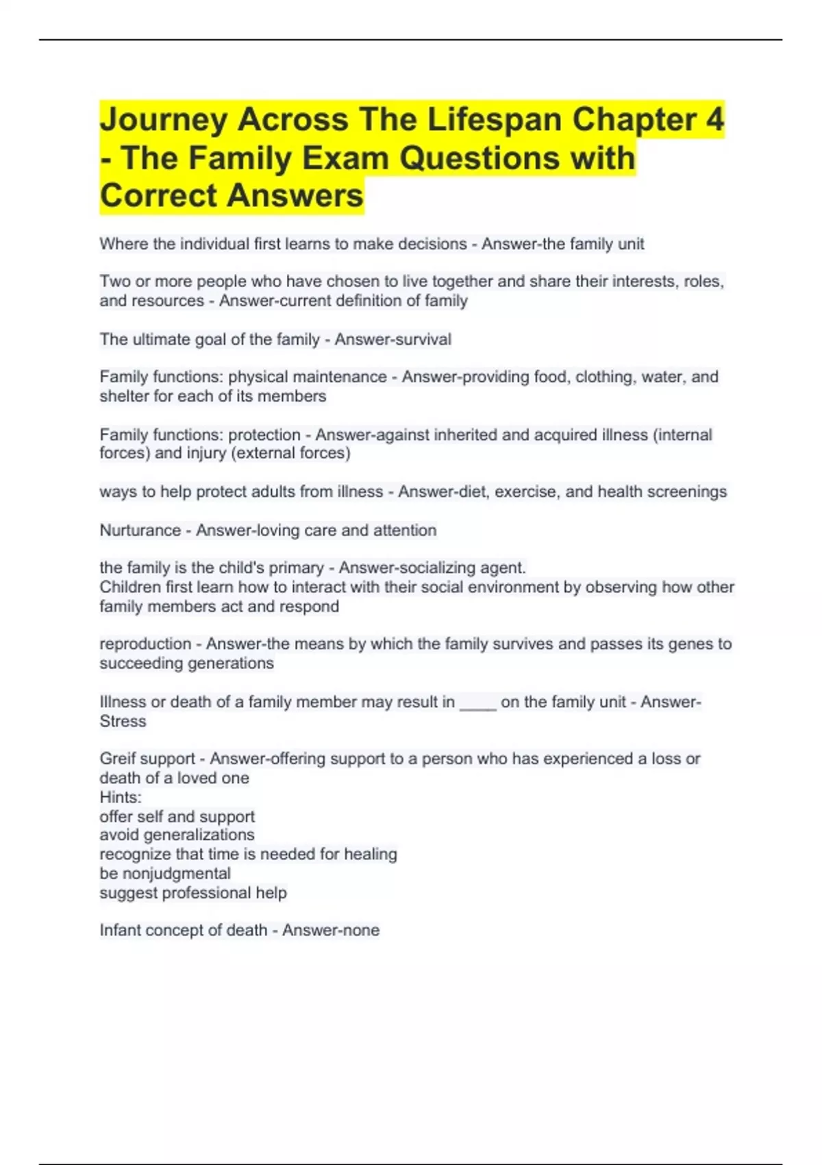 Journey Across The Lifespan Chapter 4 - The Family Exam Questions with Correct Answers Family functions: protection - Answer-against inherited and acquired illness (internal forces) and injury (external forces) ways to help protect adults from illness - Answer-diet, exercise, and health screenings Nurturance - Answer-loving care and attention the family is the child's primary - Answer-socializing agent. Children first learn how to interact with their social environment by observing how other family members act and respond reproduction - Answer-the means by which the family survives and passes its genes to succeeding generations